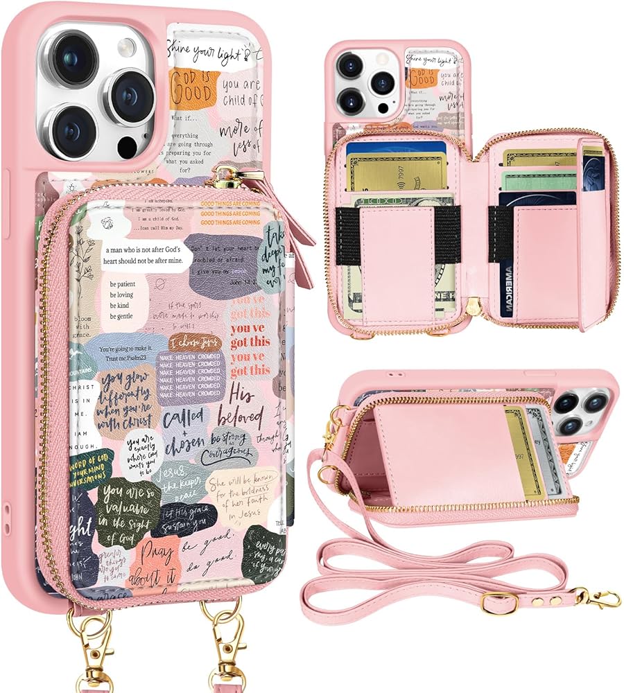 Shorogyt لهاتف iPhone 15 Pro Max Case Wallet Crossbody، RFID Blocking Card Slots Designer Christian Quotes حقيبة يد جلدية محفظة حافظات الهاتف مع حبل لهاتف iPhone 15 Promax