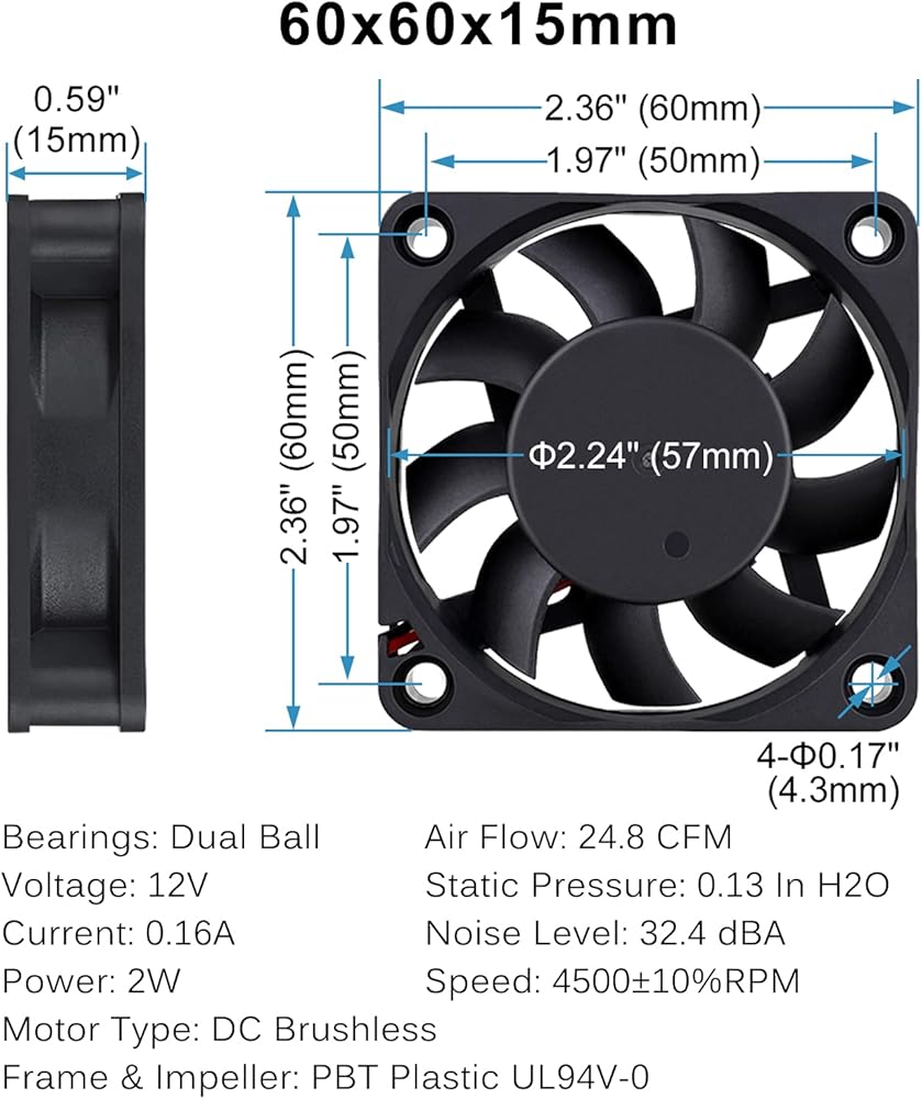- Speed: 4500RPM; Air flow: 24.8CFM; Noise: 32.4dBA