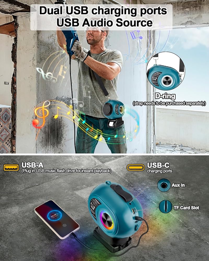• ♪ 【وقت تشغيل غير محدود】 - مكبر صوت بلوتوث لاسلكي محمول متوافق تمامًا مع بطاريات ماكيتا 18 فولت BL1820B BL1830B BL1840B BL1850B BL1860B وما إلى ذلك. وقت تشغيل غير محدود إذا كان لديك بطاريات احتياطية متعددة. (البطاريات غير متضمنة)