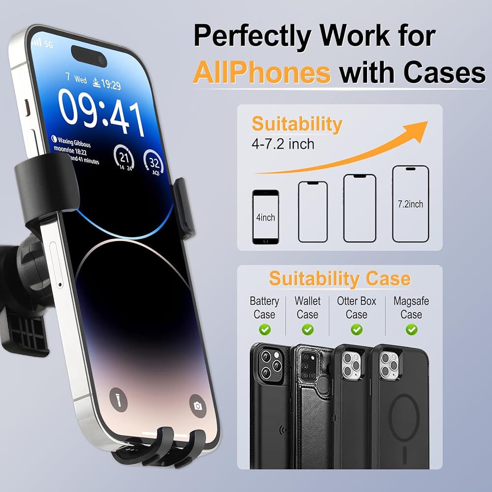 【Enhanced Compatibility】The mobile holder for car was designed to fit any smartphone size ranging from 4.7” to 6.8”. Our air vent phone holder is compatible with iPhone, Fit for Samsung Galaxy and more!