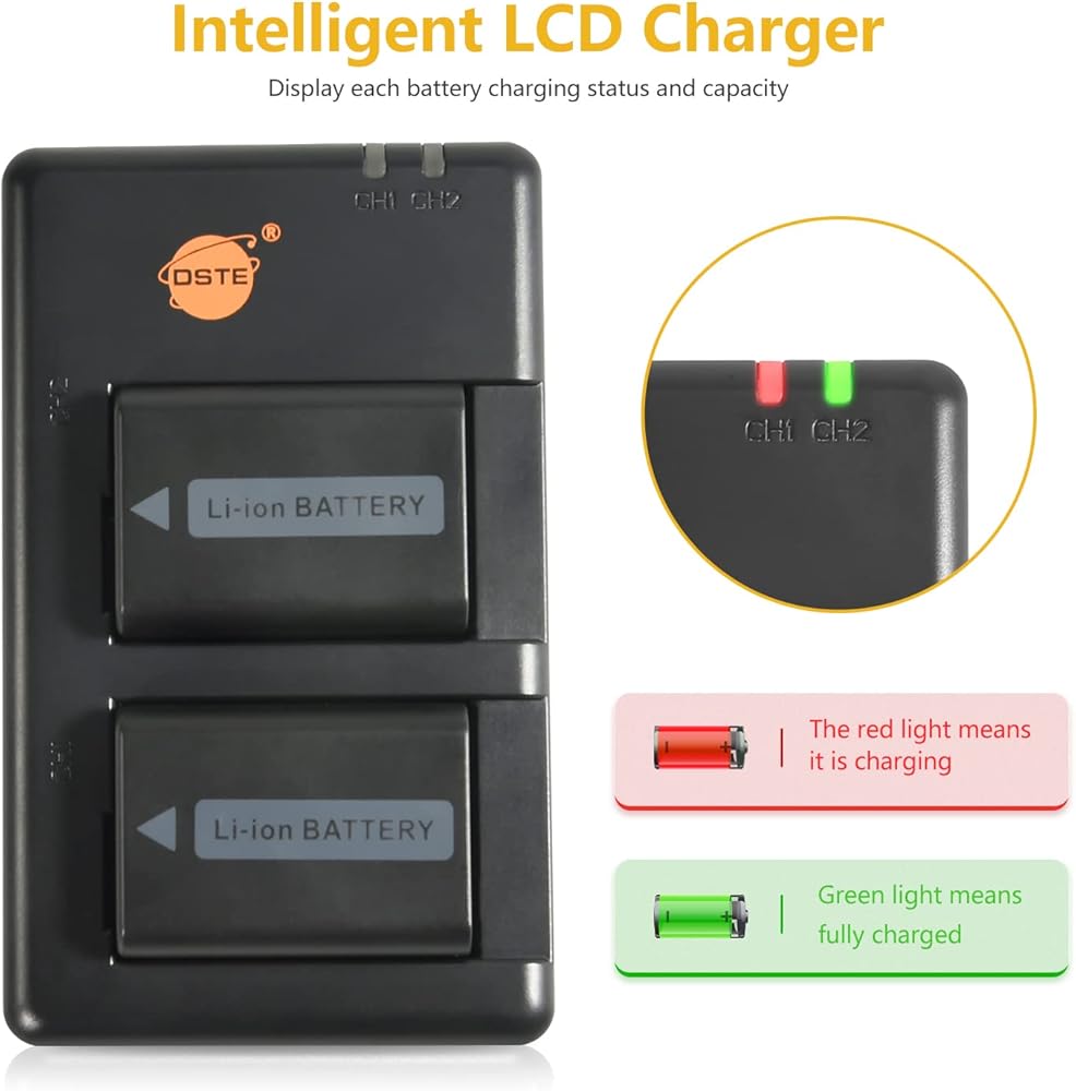 • 【DUAL USB CHAEGER AND ESAY TO READ THE CHARGING STATUS 】The dual fast charger can charge either two batteries simultaneously or 1 battery. It is easy to read the charging status with led indictor. When charging it turns on red ,and change to green when fully charged