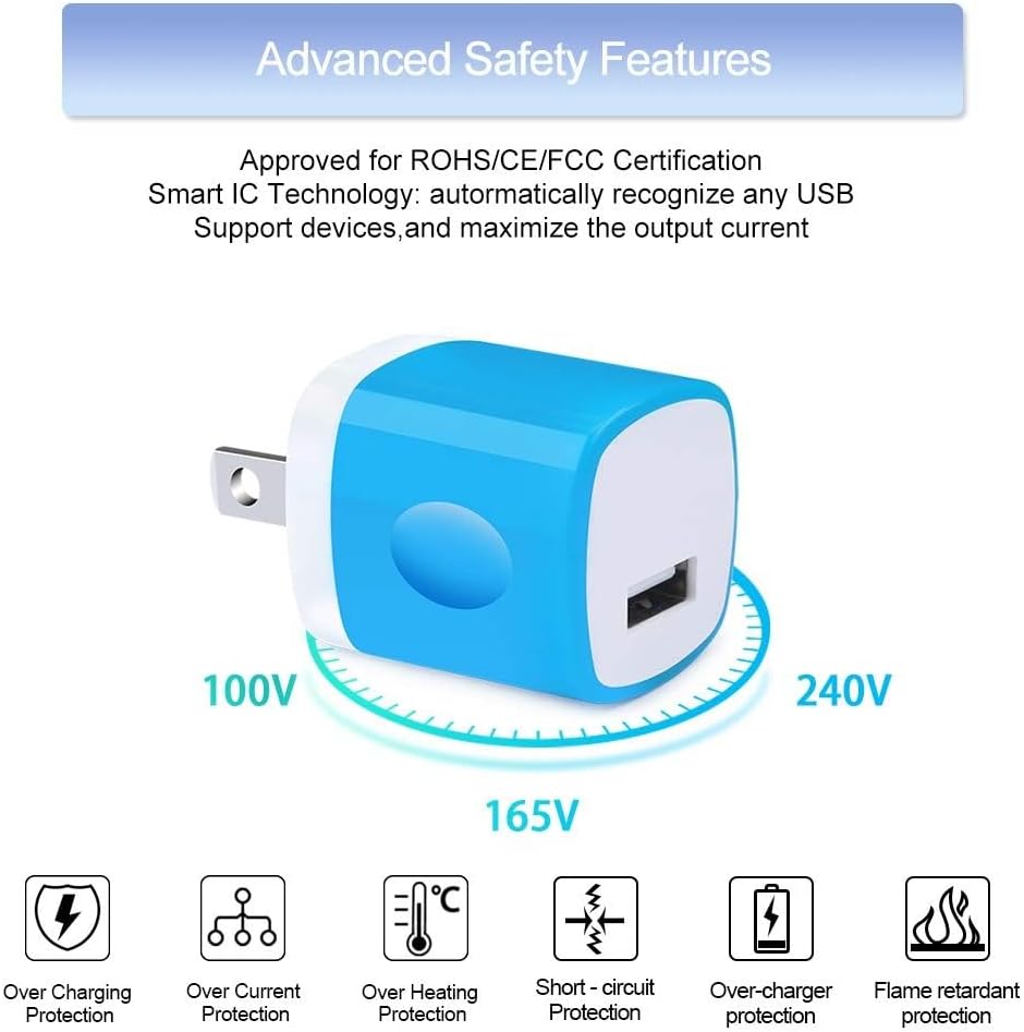 • ❤【Smart Single Port Wall Charger Box】Output 5V/1A, Input:100-240V(U.S. & World Standard). Certified by CE, FCC, and RoHS. Intelligent recognition of IC technology, automatic identification of mobile devices, and matching the best current output. When the cell phone battery is full, the USB charger block will automatically stop charge. With a hi-speed USB port will charge quickly and efficiently for almost any USB devices, and will charge up to 7% faster than the general charger plug.