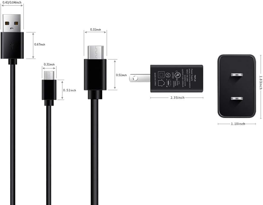 Package Includes:1 × Wall Charger1 × 6.6FT Micro-USB Charging Cable1 × 6.6FT Type C Charging Cable