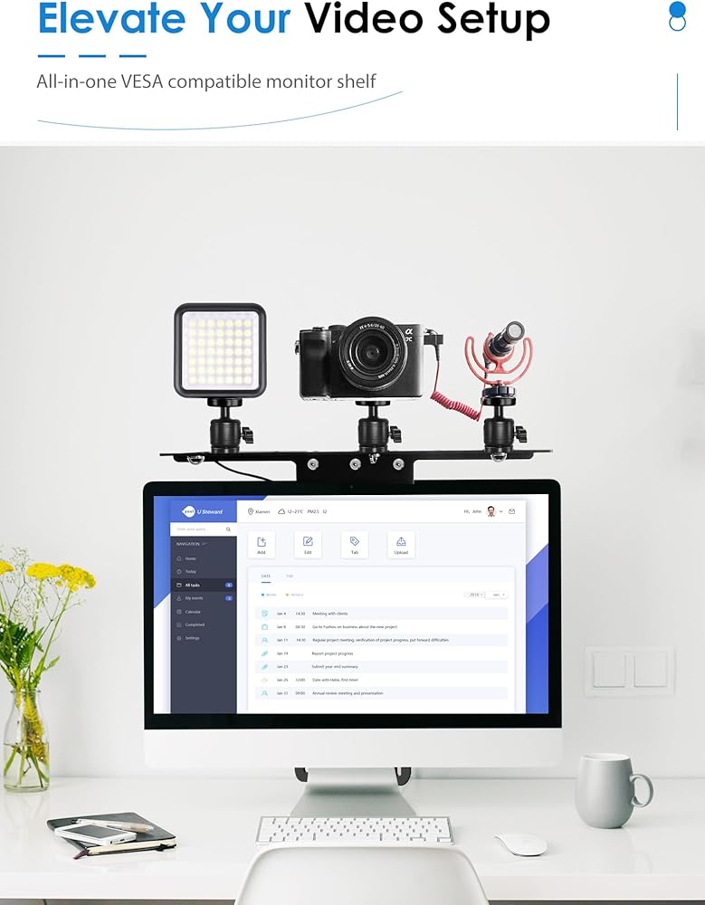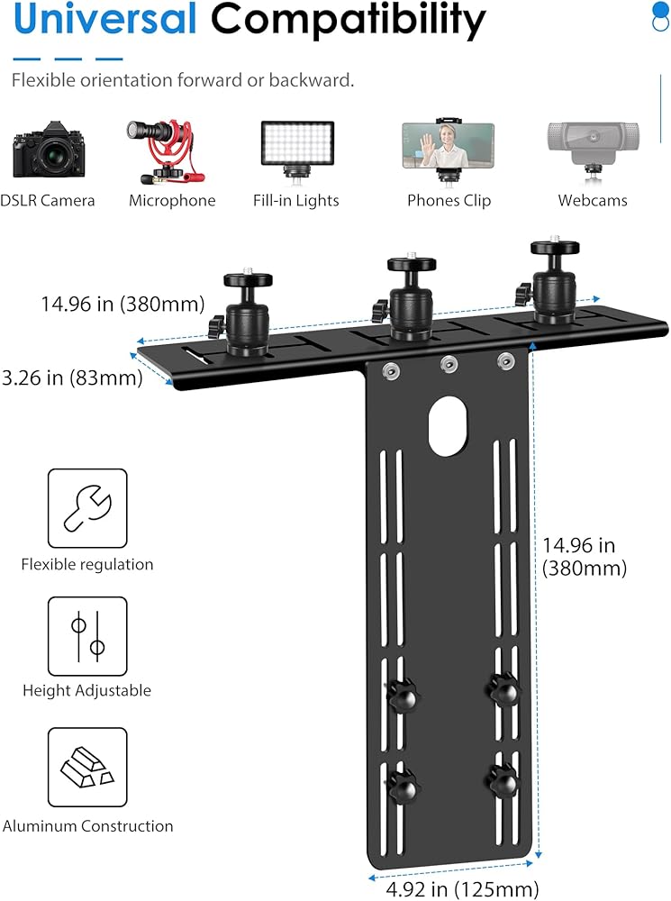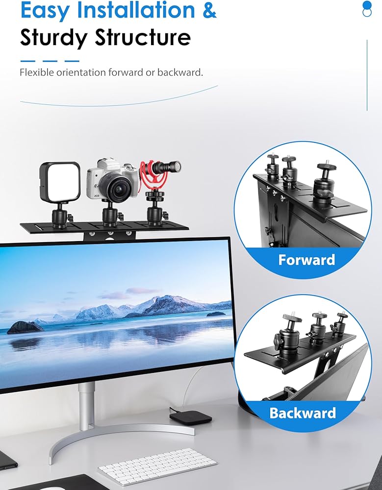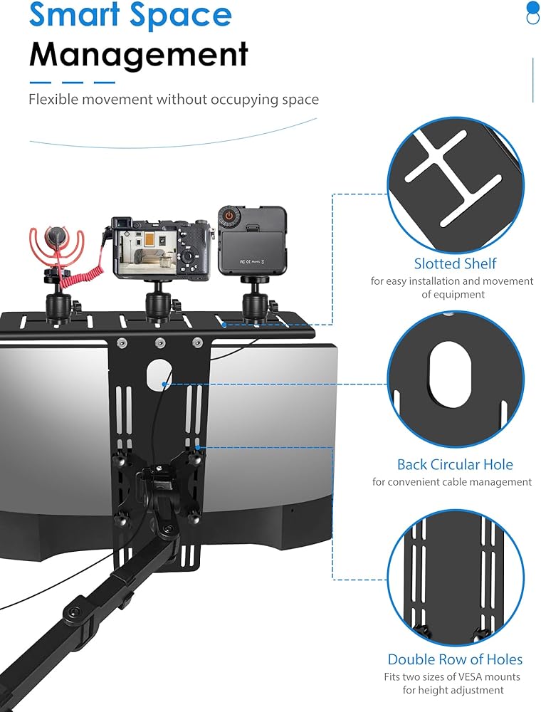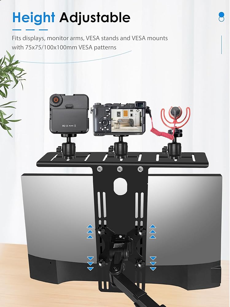 توافق واسع: متوافق مع كل من واجهات VESA 75x75 و100x100، يمكن تركيب حامل الكاميرا هذا بسهولة وتأمينه على الشاشات التي تتراوح من 17 إلى 34 بوصة، و4 مجموعات من فتحات التثبيت لضبط ارتفاع الرف. مثالي للاجتماعات عبر الإنترنت والبث المباشر مثل الكاميرات والميكروفونات والأضواء الكاشفة وكاميرات الويب.