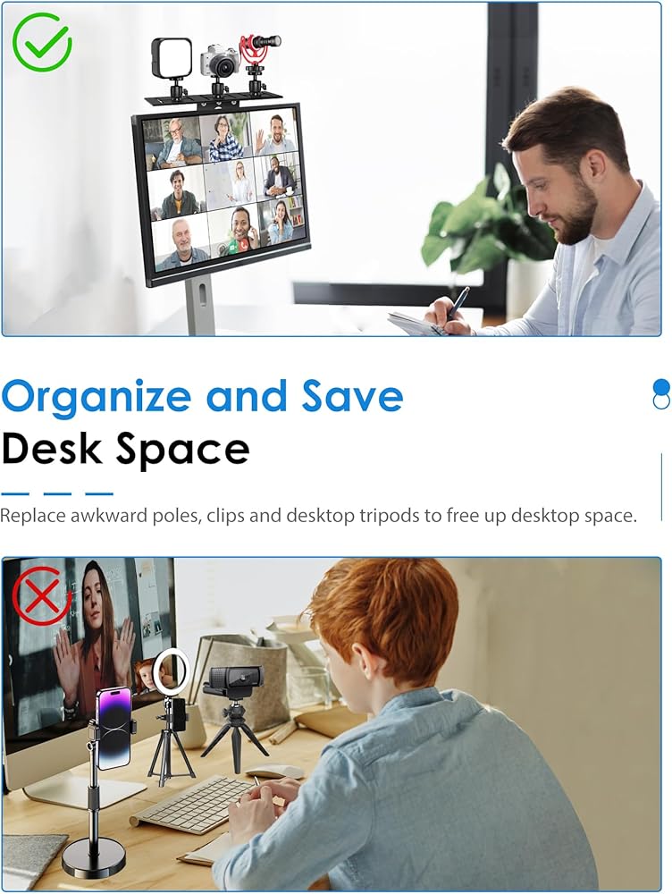 【رف شاشة متوافق مع معايير VESA الكل في واحد】قم بترقية مؤتمرات الفيديو وتجربة البث عبر الإنترنت باستخدام حامل كاميرا سطح المكتب الفائق. قل وداعًا للحوامل ثلاثية القوائم غير الملائمة لسطح المكتب وقم بتحرير مساحة سطح المكتب عن طريق وضع أجهزة البث المباشر بشكل أنيق فوق شاشة شاشتك أو خلفها.