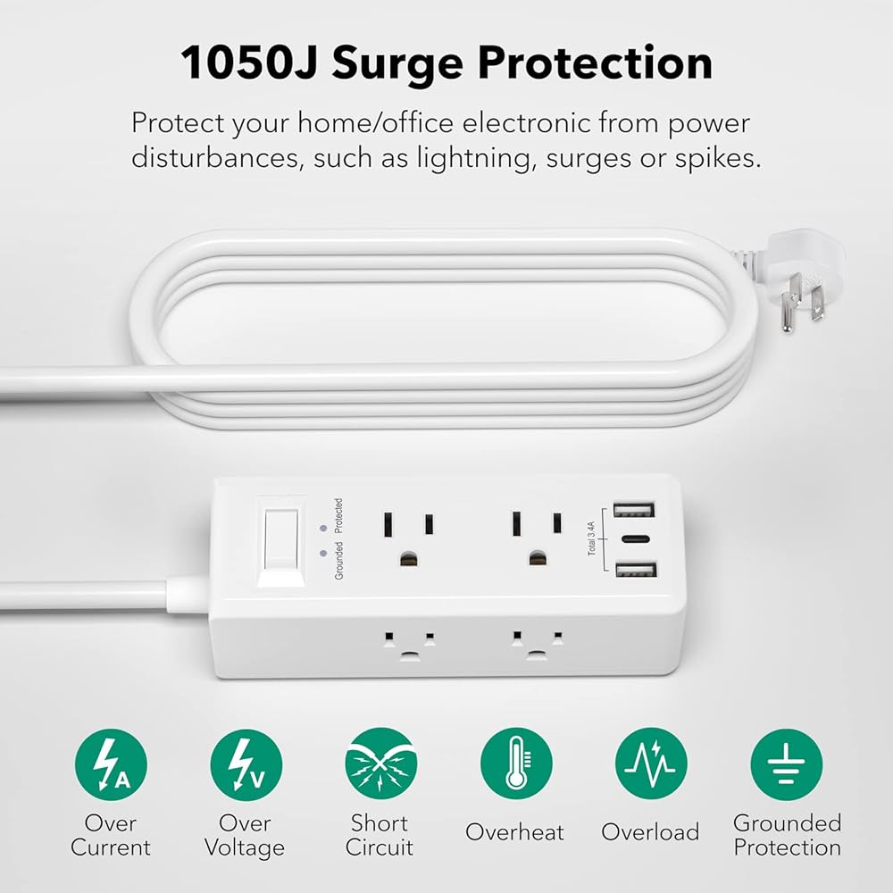 【حماية من التيار الزائد مع أضواء المؤشر】يحمي واقي التيار الكهربائي بشريط الطاقة 1050 جول أجهزتك باهظة الثمن من الحوادث مثل البرق والحمل الزائد والجهد الزائد. ستظهر مصابيح الحالة الخاصة بنا أيضًا ما إذا كانت الأجهزة محمية ومؤرضة لضمان حماية أجهزتك بشكل كامل وتشغيلها بشكل جيد.