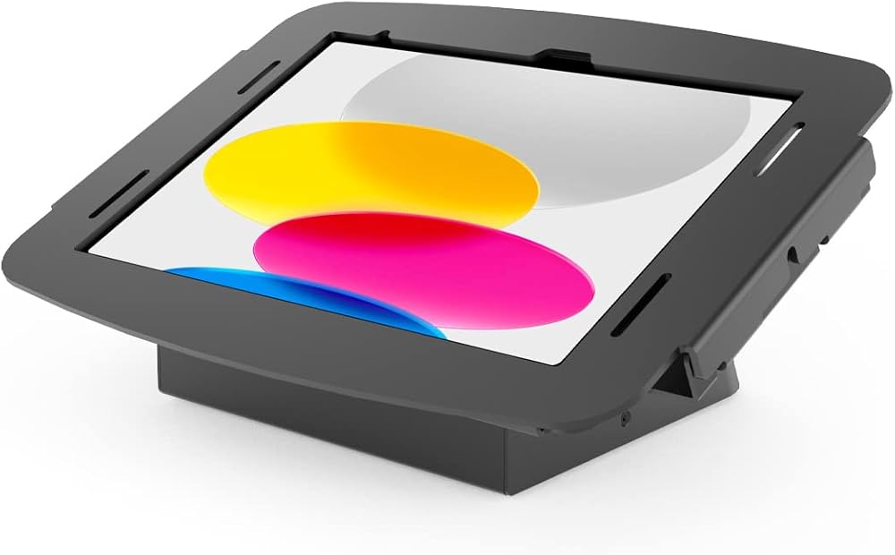 The Space Console is a secure tablet kiosk with a 25-degree viewing angle, ideal for any meeting room table for video conference management (Zoom rooms, Google Meet, Microsoft Teams...), telecommunication applications but also for telepresence, self-check-in, self-service ordering kiosk, etc. The Space Enclosure features rounded edges and open corners for improved tablet ventilation and allows for limited access to buttons and inputs. It has a Quick-Lock / Unlock keyed lock for extra safety. As with all our enclosures, the tablet can be continuously charged and have peripheral cables plugged in while mounted, as they are managed at the back of the console for a clean look. The Capsule can be freestanding, bolted to the desk, or put on an optional swivel plate. Storage area and cable management are available at the back of the console for a clean look. The AV Capsule stand also features a lock slot for a cable lock to make it theft deterrent. The stand includes a hole for wiring (back as a table mount / bottom for wall mount). With soft edges and rounded corners, the attractive aesthetic look of this console fits all environments. The storage space allows for concealing such items as a Battery Pack to allow for freedom of movement without the constraints of a charging cable. You can also secure the tablet charger inside while using an extension cord to plug into a local outlet. If no outlets are available but you have the provision for Power Over Ethernet (POE), the Power and or Power / Data adaptor can be hidden and secured inside the Capsule. Internally there is a cord relief clamp to prevent the cord from exiting the Capsule from being pulled out as well as adhesive pads for mounting items internallySpace Console Includes:* Steel Base* Lockable High-Grade Aluminum Enclosure* 2 Enclosure Keys