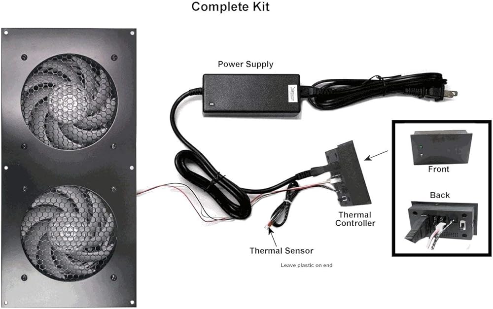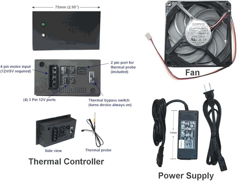 (1)Thermal controller (pre-set non-adjustable). Built in thermal sensor. Controls power to your fans to cool when you need it. With external temperature probe wire for spot placement. On @ 86°F Off @ 81°F (+/- 1°)