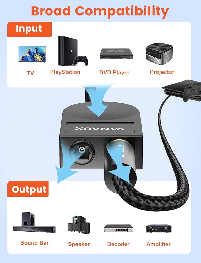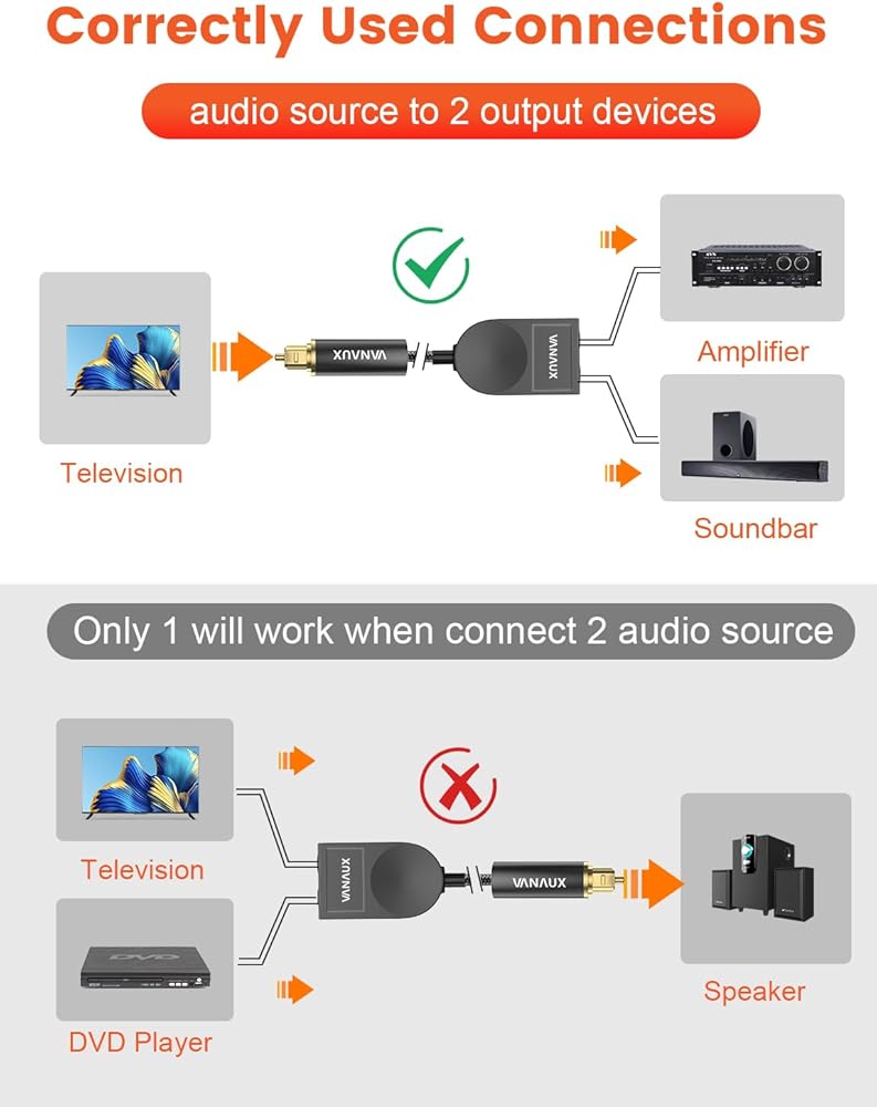 【جودة صوت رائعة】يسمح لك مقسم الصوت من الألياف الضوئية VANAUX Toslink بتوصيل مصدر صوت بصري واحد وتقسيمه إلى جهازين استقبال، مثل جهاز استقبال A/V وشريط الصوت.