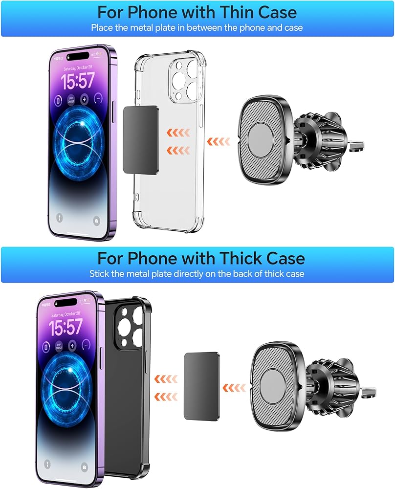 ✅【Upgraded Metal Hook】: The metal hooks in this Magnetic car mount are made of high quality metal, which is significantly better than plastic hooks that break easily. Together with the upgraded locking mechanism, it ensures an ultra-stable connection between the Magnetic phone mount and the vent. to ensure that your phone remains stable and does not fall off even on bumpy roads.