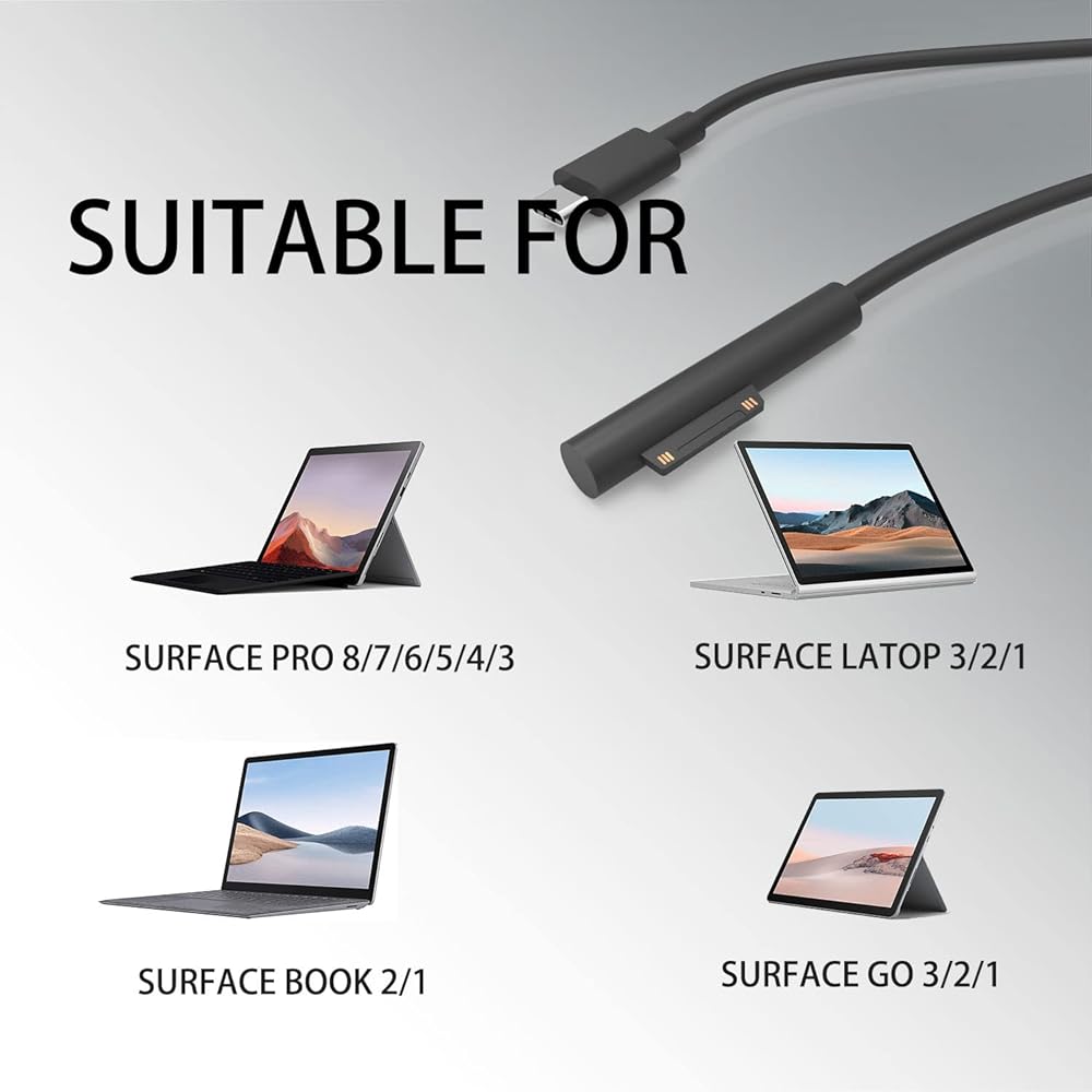 The charging cable can be used as a replacement cable for Surface Pro 3 4 5 6 7 8, Surface Laptop 3 2 1, Surface Go and Surface Book