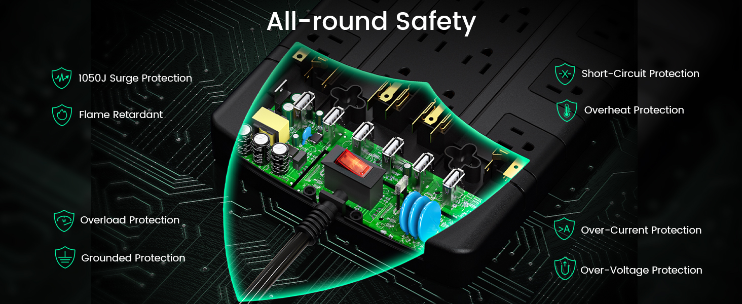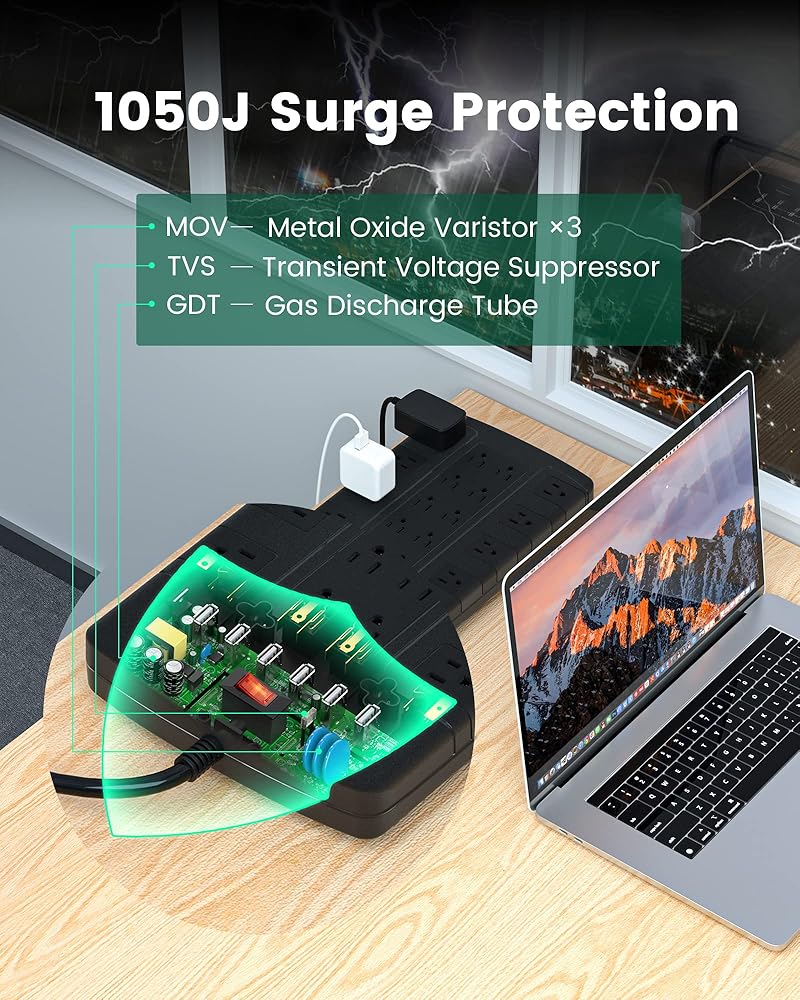 • 【حماية من اندفاع التيار 1050J】تم تصميمه مع حماية من اندفاع التيار بقوة 1050 جول، إلى جانب العديد من ميزات الحماية الأخرى، يعمل شريط الطاقة الواقي من اندفاع التيار هذا مع USB على حماية أجهزتك القيمة أينما تم استخدامها.