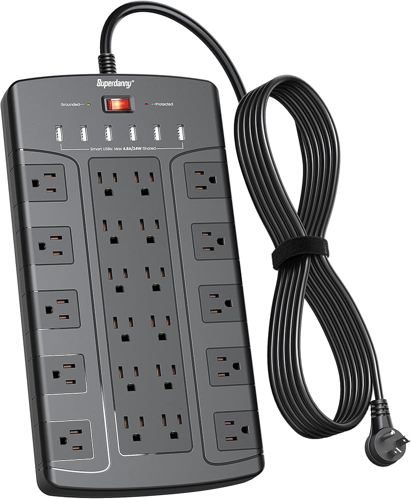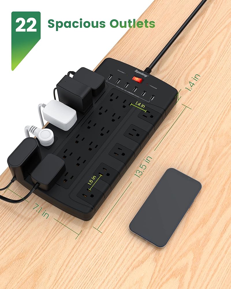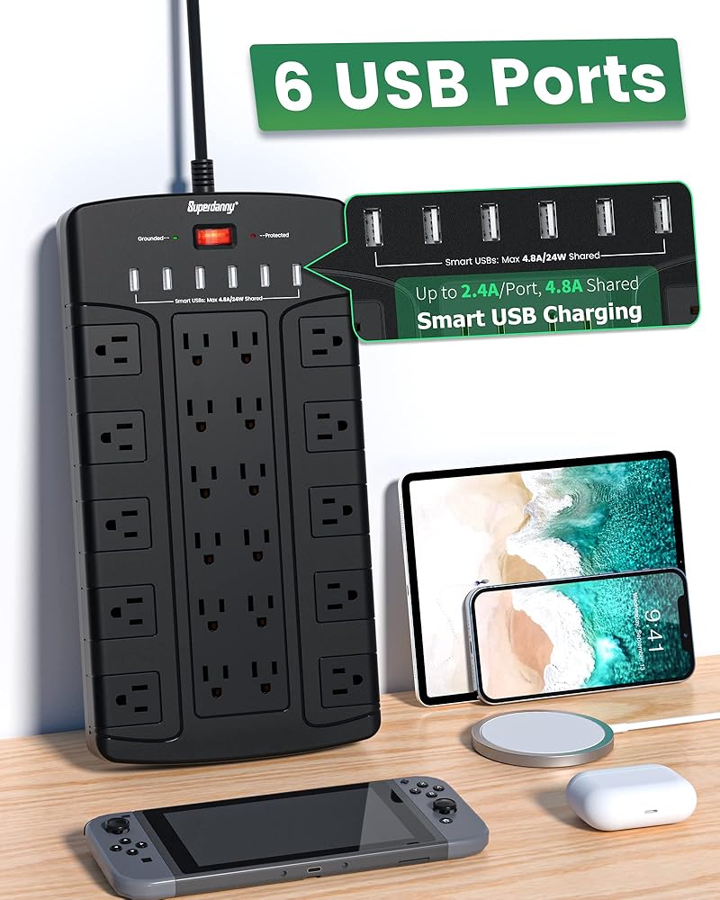 قطاع الطاقة الواقي من زيادة التيار، سلك تمديد قابس مسطح SUPERDANNY بطول 6.5 قدم مع 22 منفذًا متعددًا و6 منافذ USB، شريط طاقة كبير شديد التحمل 15 أمبير/1875 وات للمنزل والمكتب والشاطئ وغرفة الألعاب، أسود