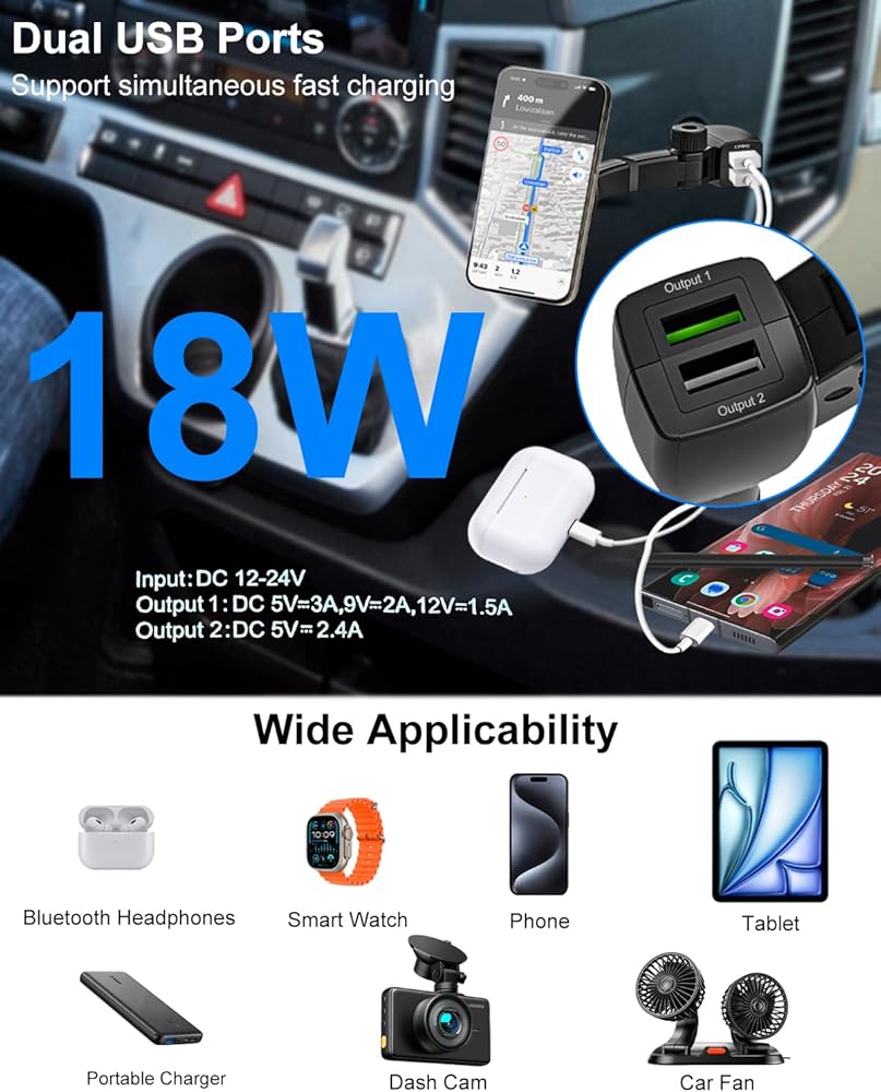✔️【قابلية تطبيق وتوافق واسعين】حامل هاتف السيارة ولاعة السجائر مناسب للسيارة والشاحنات وسيارات الدفع الرباعي والمركبات الترفيهية وغيرها من المركبات. يتوافق حامل شاحن الهاتف المحمول بالسيارة مع أجهزة iPad وiPhone ومسجل القيادة وسماعات البلوتوث والشاحن المحمول والكمبيوتر اللوحي للهاتف المحمول وأجهزة أخرى للشحن