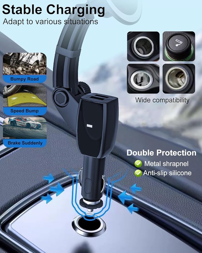 ✔️[شحن ثابت] تم تجهيز منفذ حوامل الهاتف المحمول لسيارتك المتصلة بولاعة السجائر بشظايا معدنية وسيليكون غير قابل للانزلاق لتوفير حماية مزدوجة، مما يقلل من انقطاع الطاقة بسبب ضعف الاتصال ويضمن شحنًا مستقرًا للجهاز.