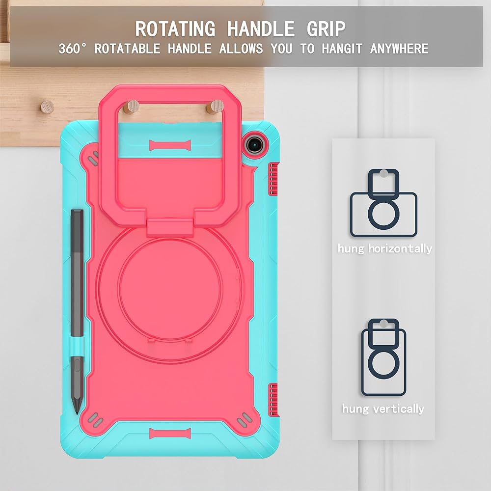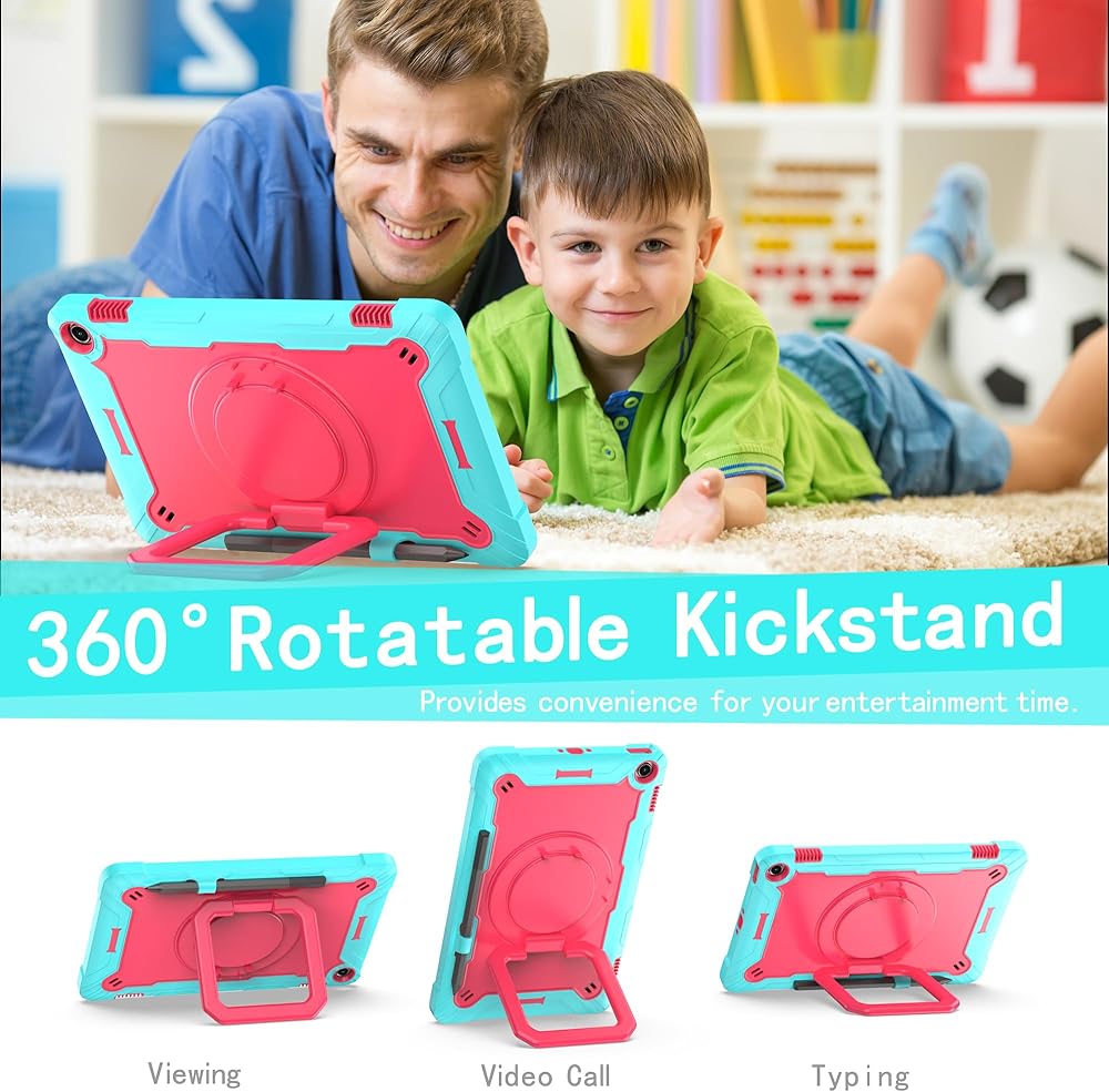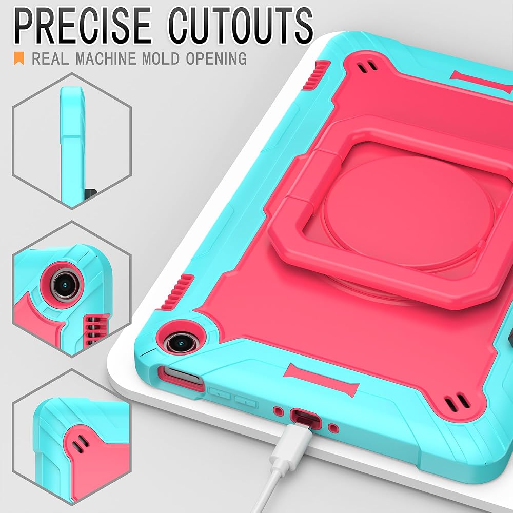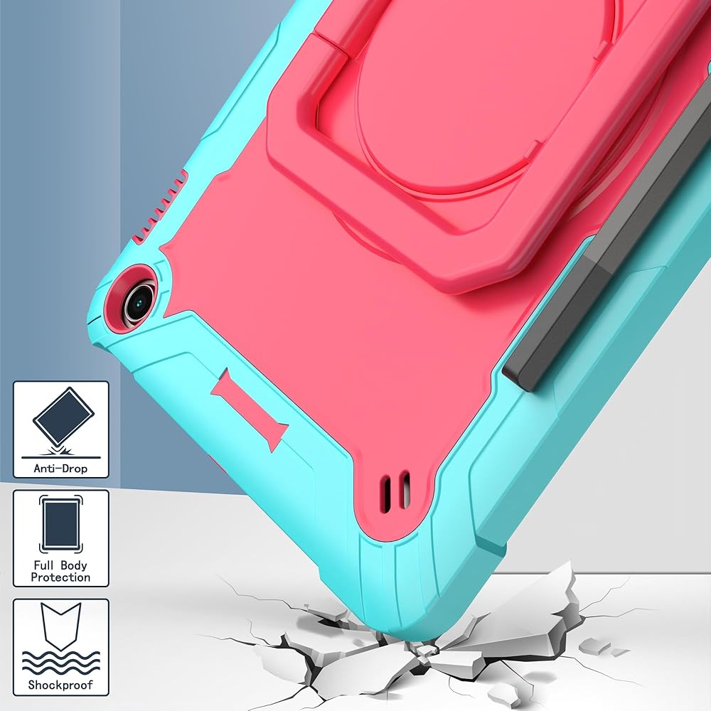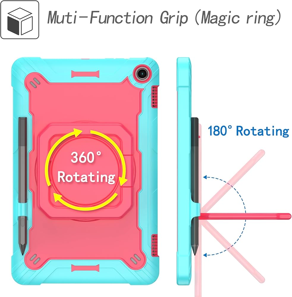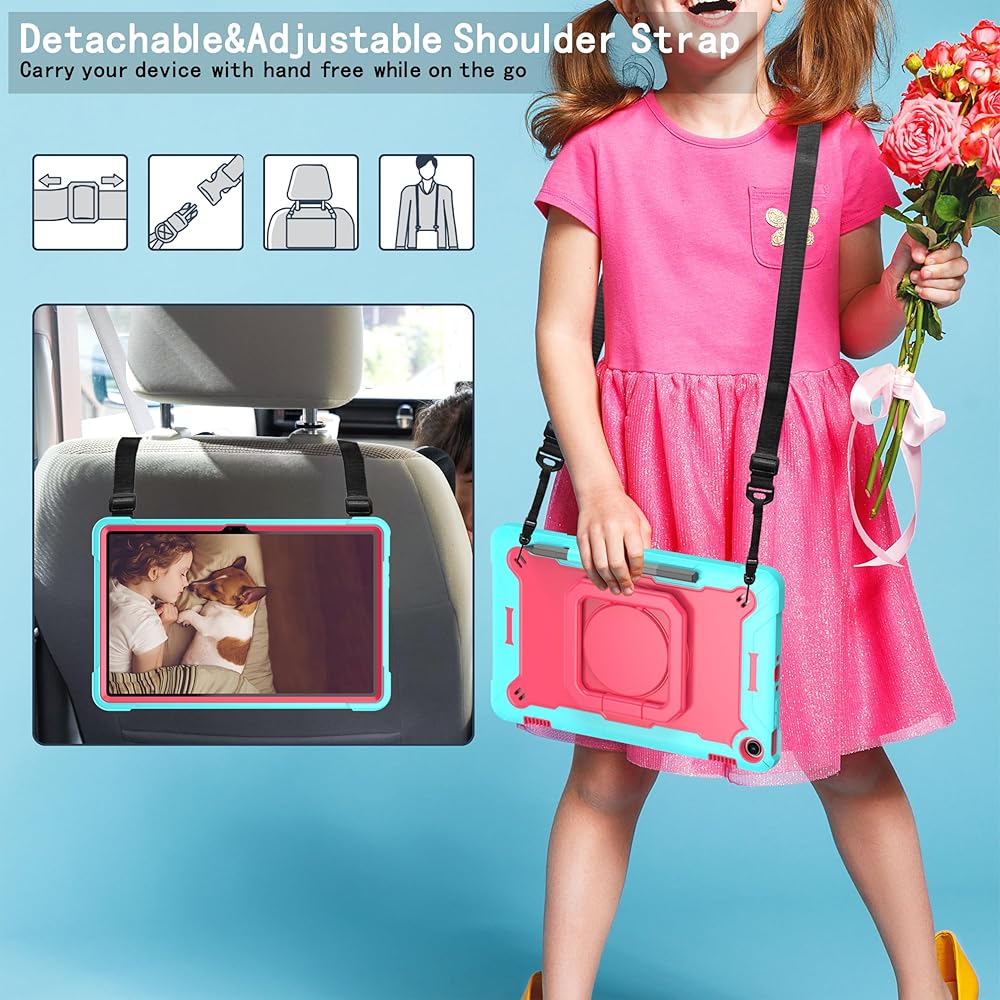 The zukof Case for Amazon Fire Max 11 inch Tablet (13th Generation, 2023 Release) Hybrid Shockproof 360 Rotating Multi-Functional Ring Stand Case with Shoulder Straps provides multi-angle viewing for watching movies and reading. The case is designed with dual layers, a shock-absorbing TPU outer cover and a hard PC inner cover. The raised screen bezel and camera hole offer full protection for screen and camera. The shoulder strap is adjustable and detachable, making it easy to carry your tablet hands-free.