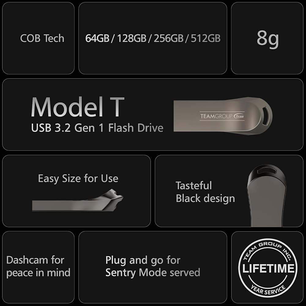 محرك أقراص فلاش TEAMGROUP Model T USB 3.2 Gen 1 (3.1/3.0) سعة 64 جيجابايت، قم بالتوصيل والتشغيل لوضع Tesla Sentry Mode Model 3/Model S/Model X/Model Y TMODELT364GF01