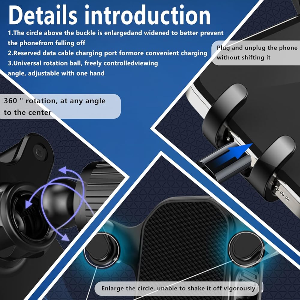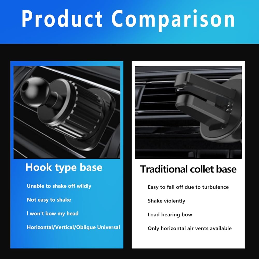 • Product Design: Different to normal phone holders, this cell phone holder has the hook-type base and the two curved clamp arms to form a unique triangular structure for super strong stability. Besides, you can also achieve quick pick and place by one hand, effectively preventing you from distraction while driving, improving your driving safety.