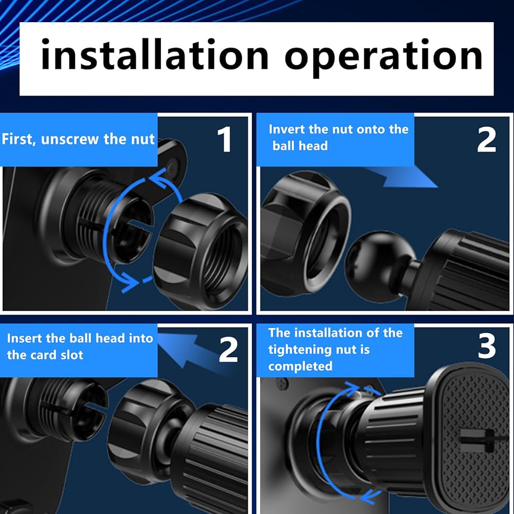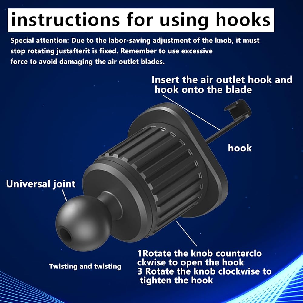 • Quick Installation: Firstly, unscrew the nut and put it upside down on the ball head. Secondly, insert the ball head into the card slot and tighten the nuts. Then, insert the metal hook into the car air outlet to make it hook onto the blades. Finally, turn the rotating knob clockwise to tighten the hook to complete the installation.