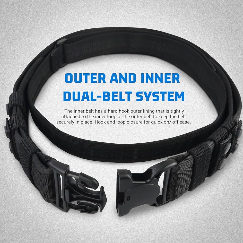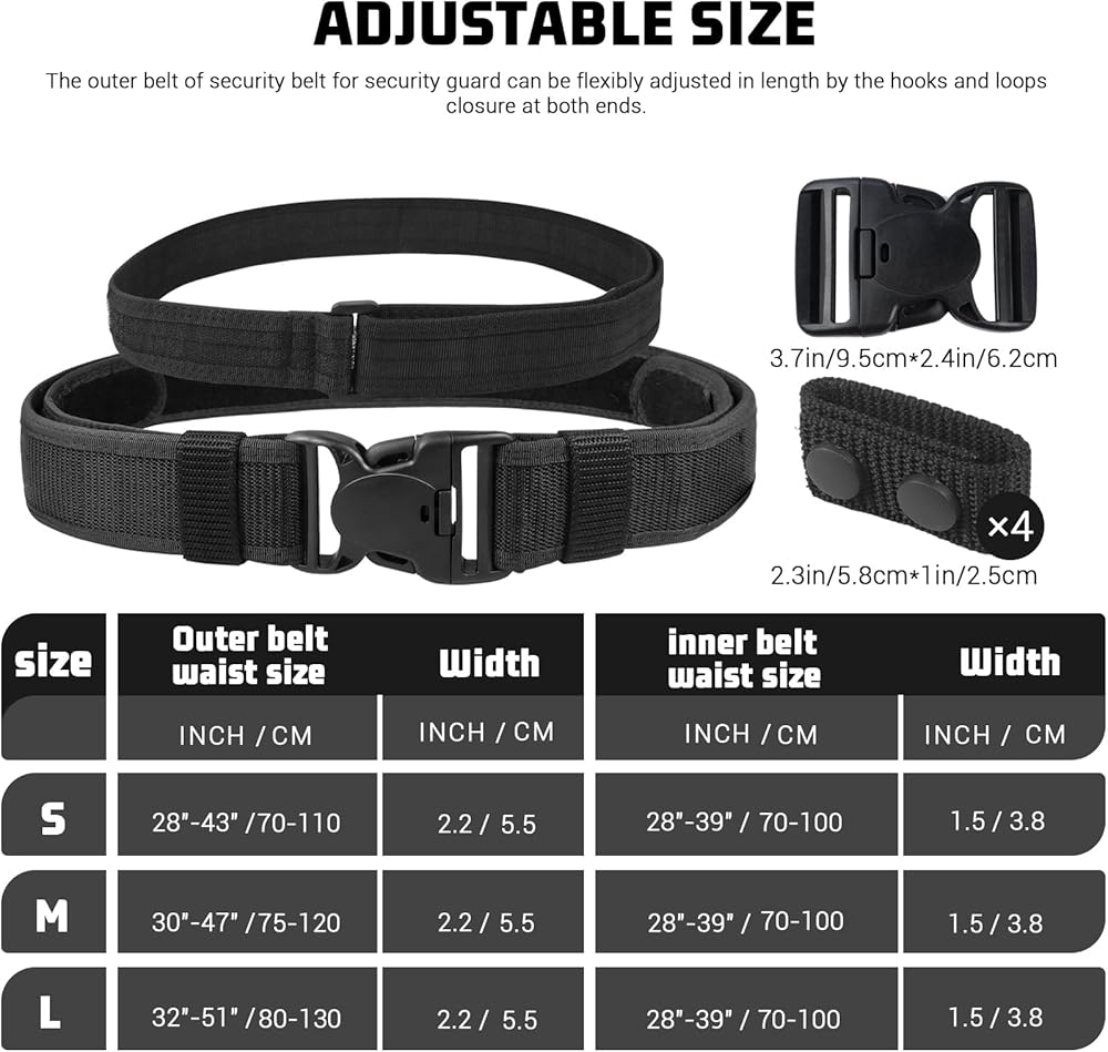 【Outer and Inner Dual-Belt System】 High-quality nylon webbing outer belt has soft loop inner lining. With the hook and loop at 2 ends, the size of the outer belt can be easily adjusted. It can also be used as a duty belt alone as your needs. The inner belt has a hard hook outer lining that is tightly attached to the inner loop of the outer belt to keep the belt securely in place. Hook and loop closure for quick on/ off ease. 【Heavy Duty Utility Belt】Made of 1680D high-density nylon webbing and internal stiffener, the 2.2in/5.5cm wide duty belts law enforcement has excellent load-bearing capacity. It holds its rigid shape under the weight of your EDC duty gear like flashlights, key clips, gloves, holsters. 【3-Point Release Buckle】The 3-point buckle is more reliable and safer, preventing the belt from opening accidentally. Just press 3 points simultaneously to release the buckle. The police duty belts is suitable for any law enforcement or security, such as policemen, cop, security guard, correctional officer, armed guard, sheriff, etc. 【Adjustable Size】The outer belt of security belt for security guard can be flexibly adjusted in length by the hooks and loops closure at both ends. The S size 51in length is suitable for 29-43in waist, the M size 55in length is suitable for 31-47in waist, and the L size 59in length is suitable for 34-51in waist. 【Abundant Accessories】You will get a 2.2in/5.5cm wide outer belt with 2 nylon loops, a 1.5in/3.8cm wide inner belt, 2 release buckles(1 for spare) and 4 double snap duty belt keepers to better fix and separate your gears.