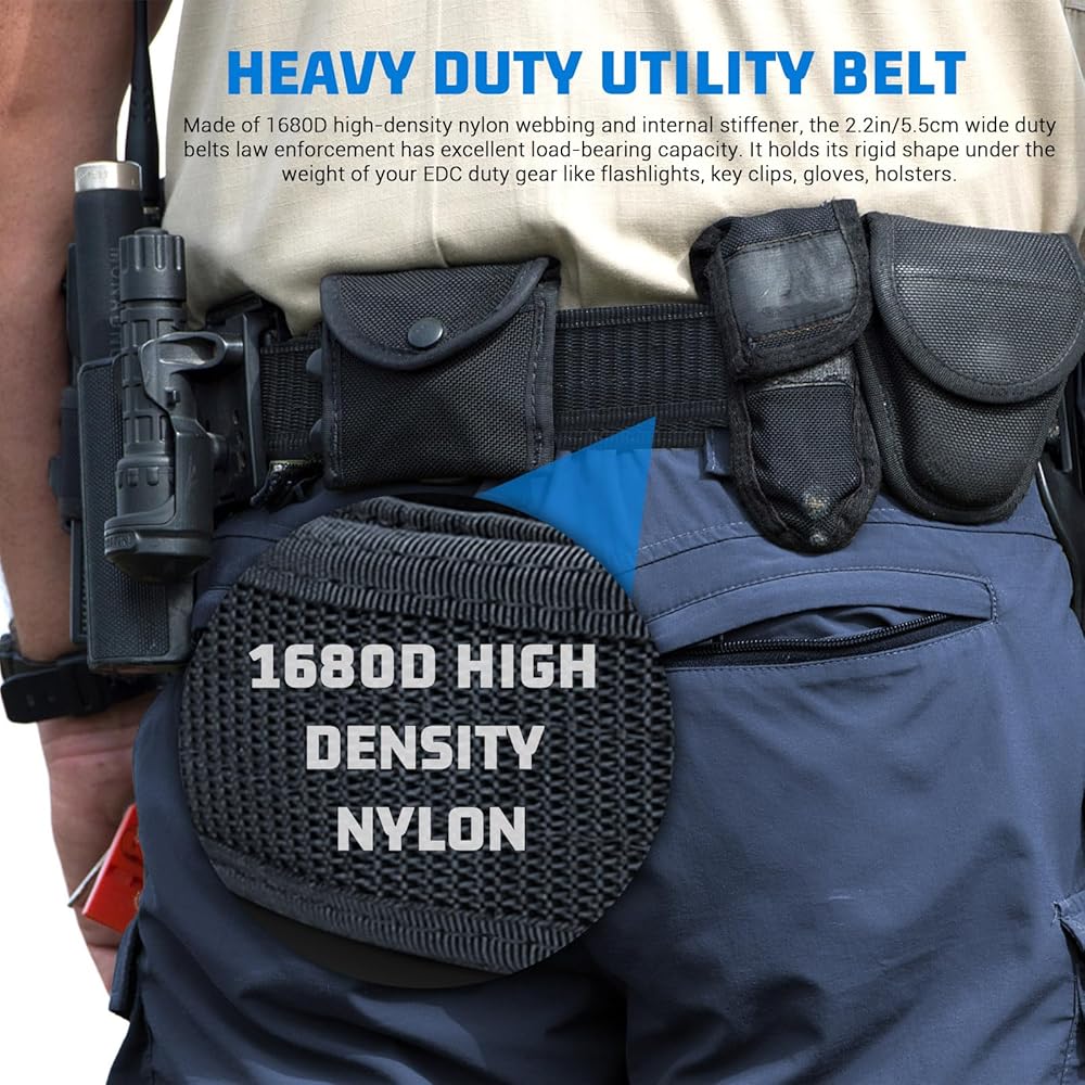 【Heavy Duty Utility Belt】Made of 1680D high-density nylon webbing and internal stiffener, the 2.2in/5.5cm wide duty belts law enforcement has excellent load-bearing capacity. It holds its rigid shape under the weight of your EDC duty gear like flashlights, key clips, gloves, holsters.