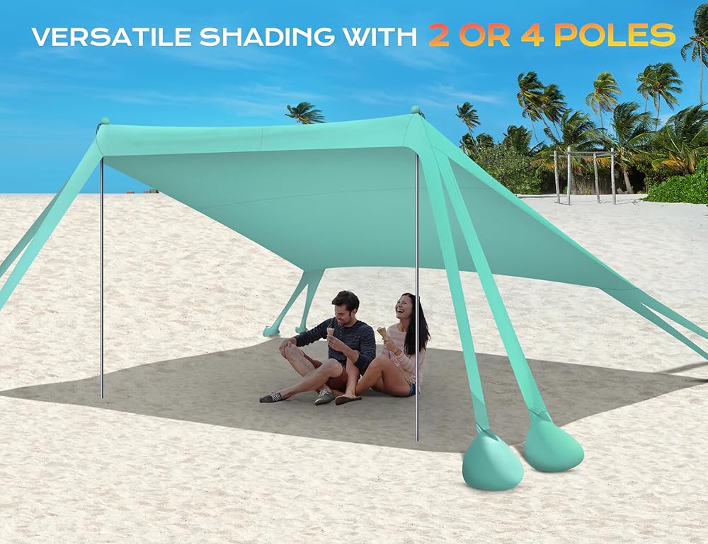 【إعداد سريع ومرن】الإعداد سريع وبسيط. استخدم 2 أو 4 أعمدة دعم لضبط الشكل وفقًا لعدد الأشخاص وزاوية الشمس. يمكن لشخص واحد إكمال عملية الإعداد خلال 5 دقائق فقط، مما يتيح لك المزيد من الوقت للاسترخاء والاستمتاع.