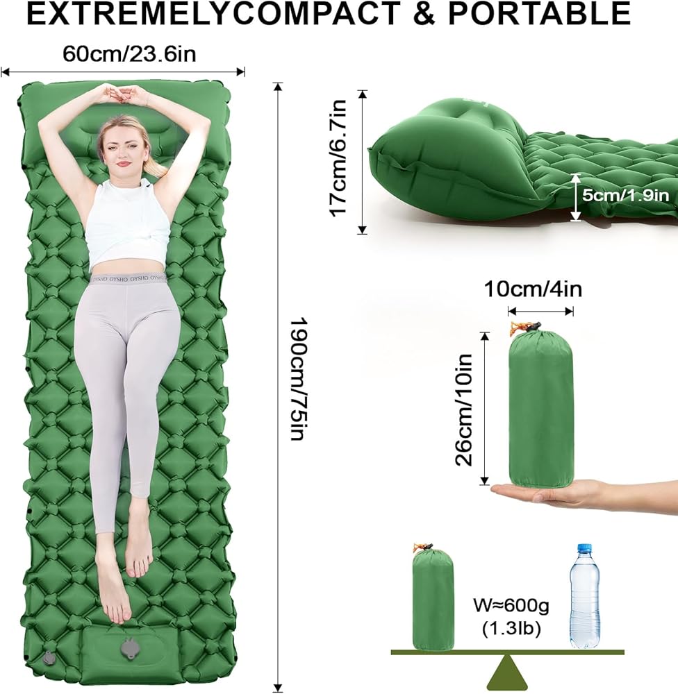 【تصميم مبتكر ودعم للنوم مع وسادة】 تتميز وسادة النوم ذاتية النفخ للتخييم بتصميم مبتكر، جنبًا إلى جنب مع تقنية رسم خرائط الجسم، مما يوفر تجربة تخييم مثالية ومتينة ومريحة للغاية مناسبة لأي وضع نوم. ووسادة التخييم المدمجة مصممة لتخفيف ضغط الظهر والرقبة، مما يسمح لك بتعديل توازن جسمك وراحته بحرية، سواء على ظهرك أو جانبك، مما يضمن أقصى قدر من الراحة والدفء لنومك طوال الليل!