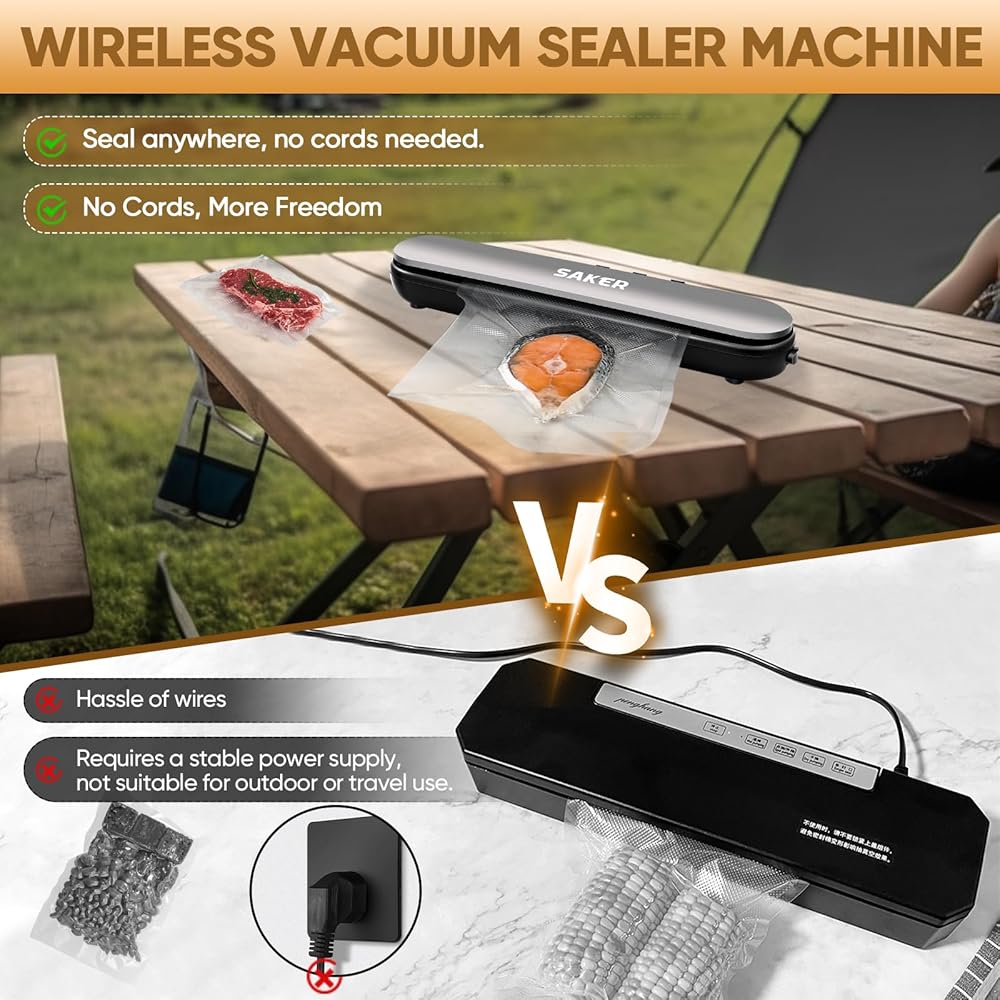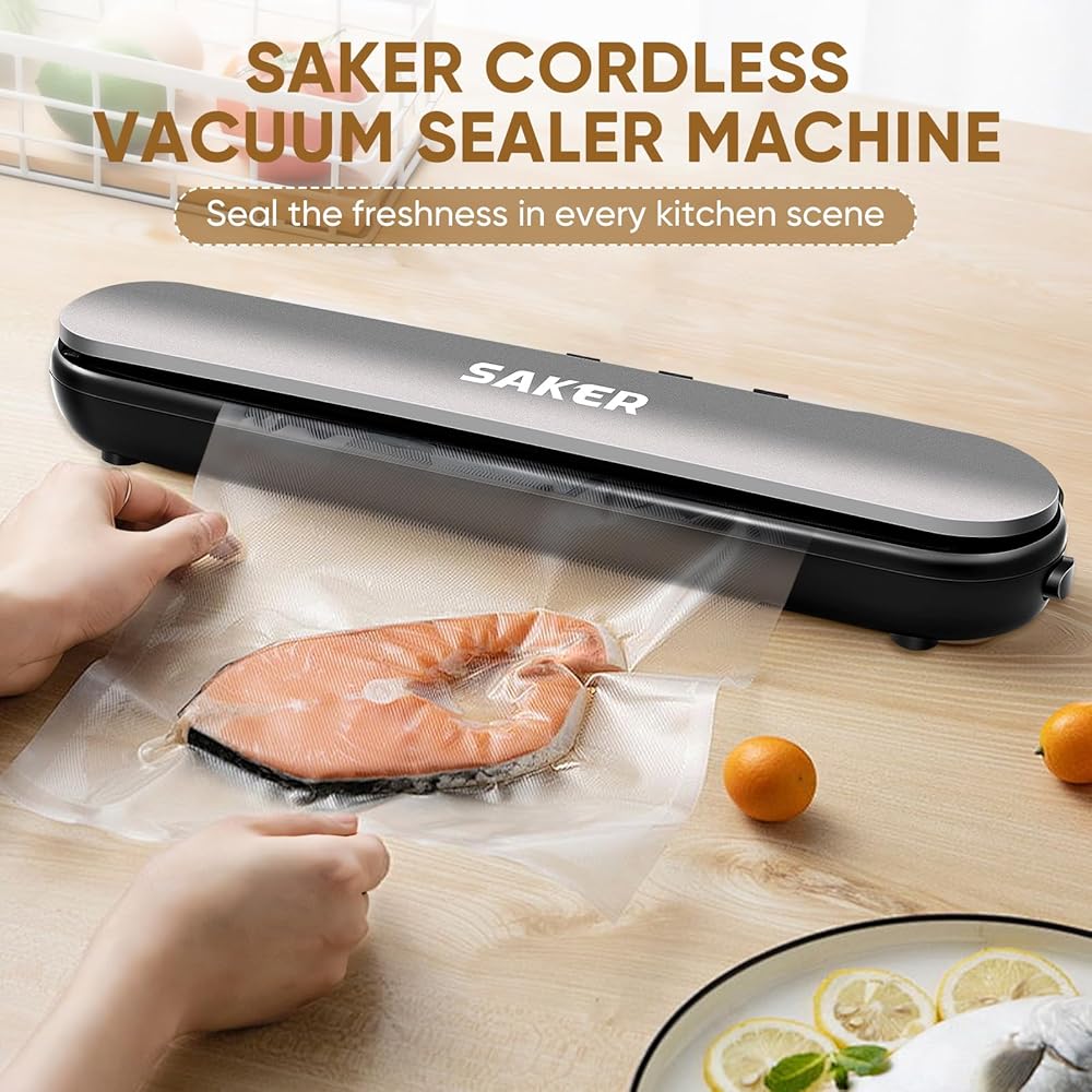 تصميم مدمج ولاسلكي: على الرغم من قدراته القوية، يتميز جهاز Saker Vacuum Sealer بتصميم مدمج وأنيق يناسب أي مساحة مطبخ بسهولة. جمالها الحديث لا يكمل ديكور المطبخ فحسب، بل يضمن أيضًا سهولة التخزين عند عدم الاستخدام. تصميم خفيف الوزن ولاسلكي يجعله قابلاً للحمل، لذا يمكنك استخدامه في أي مكان، بدءًا من مطبخك المنزلي وحتى حفلات الشواء والنزهات الخارجية.