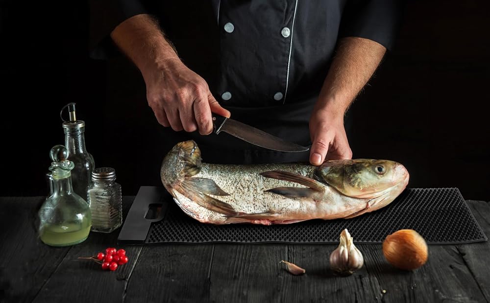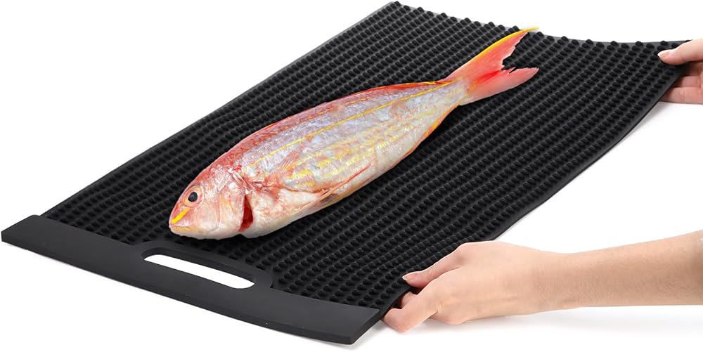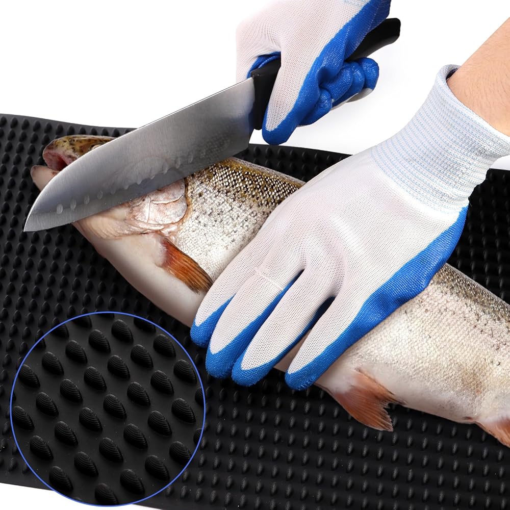 سطح غير قابل للانزلاق: تتميز السجادة بسطح غير قابل للانزلاق يحافظ على الشرائح في مكانها بشكل آمن، ويمنعها من القفز أو الانزلاق، ويحافظ على منطقة عملك نظيفة، ويضمن سلامتك أثناء التعامل مع الأسماك.