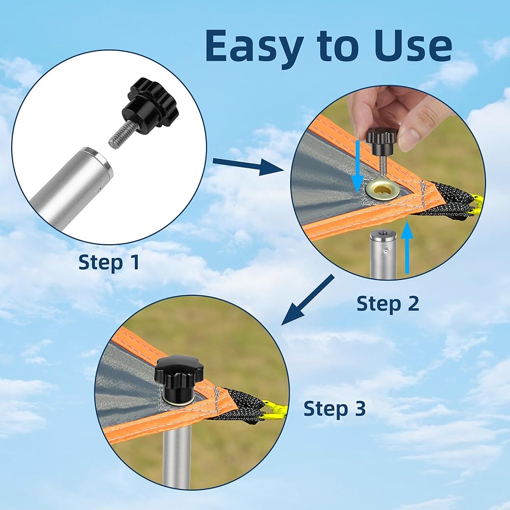 Anti-slip and Torsion Design:The tent poles come with removable black flower shaped non-slip plastic heads on the front of the poles. Slide the non-slip head through the canopy grommets and screw the tent poles onto the plastic head by twisting so that the tent is held in place