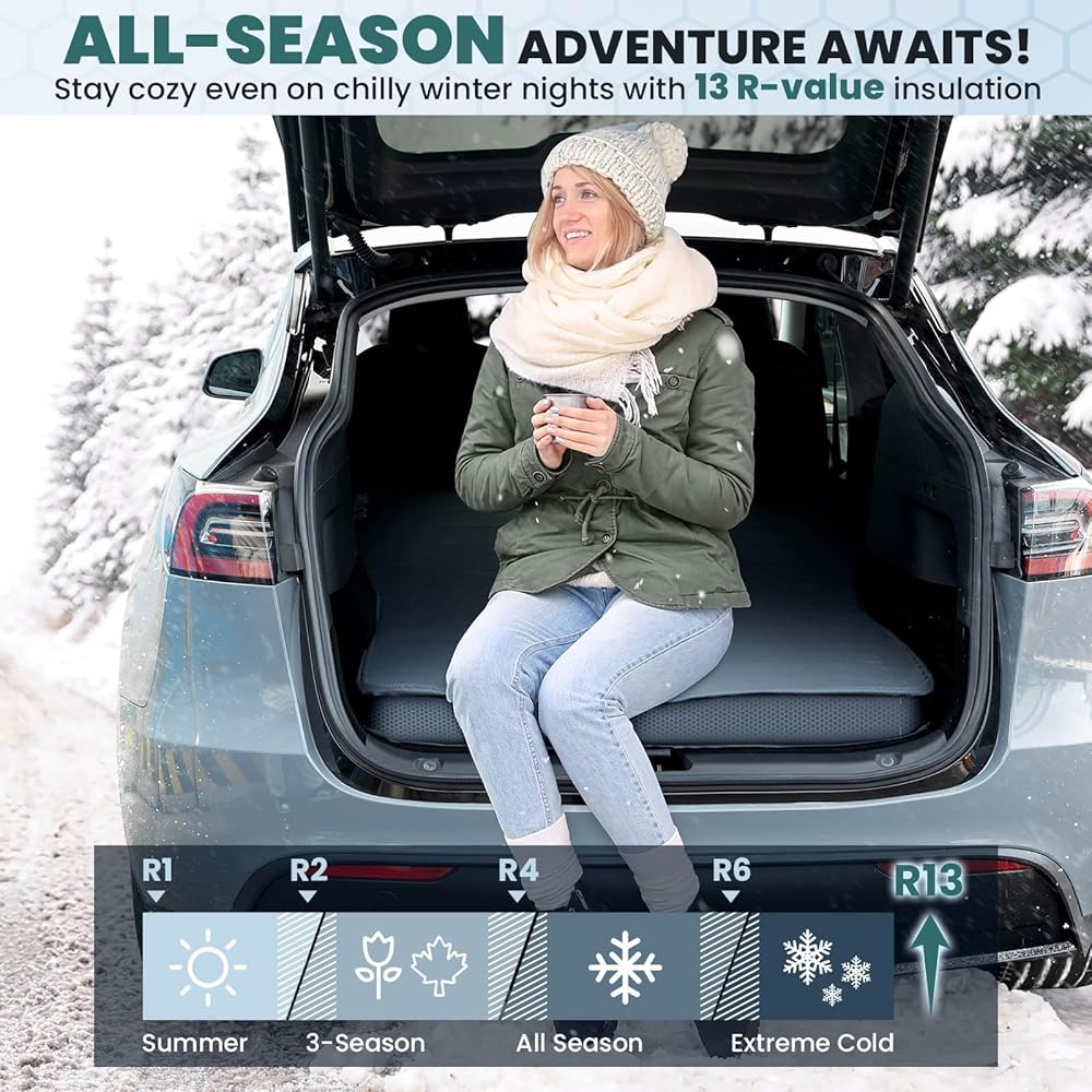 🌡️ 𝗬𝗘𝗔𝗥-𝗥𝗢𝗨𝗡𝗗 𝗪𝗔𝗥𝗠𝗧𝗛 𝗪𝗜𝗧𝗛 𝟭𝟯 𝗥-𝗩𝗔𝗟𝗨𝗘 - استعد للاستمتاع براحة لا مثيل لها مع وسادة مرتبة التخييم الخاصة بنا، والتي تتميز بقيمة R المذهلة البالغة 13. تم تصميمها ببراعة لتوفير الدفء والعزل ضد برودة الأرض طوال الفصول، تضمن وسادة التخييم ذاتية النفخ ملاذًا مريحًا ضد البرد القارس في الشتاء.