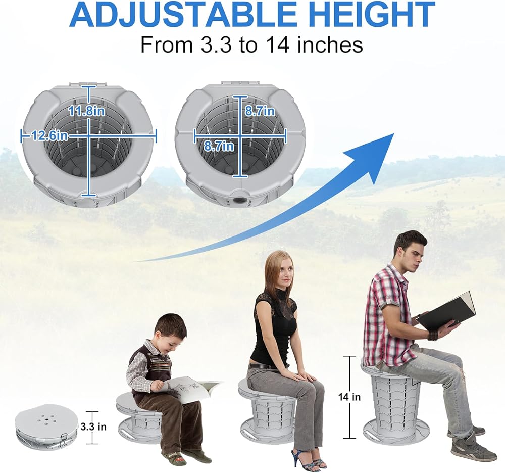HEIGHT ADJUSTABLE: This portable potty for adults is designed with an innovative fish-cale structure, allowing you to adjust the height from 3.3 to 14 inches in 7 steps. It's quick and easy - just pull and twist clockwise to start using instantly! After use, simply rotate counterclockwise and press it down into a disk. This small and lightweight folding toilet caters to different heights and is the best choice for camping,hiking,long trips,traffic jams,and more.