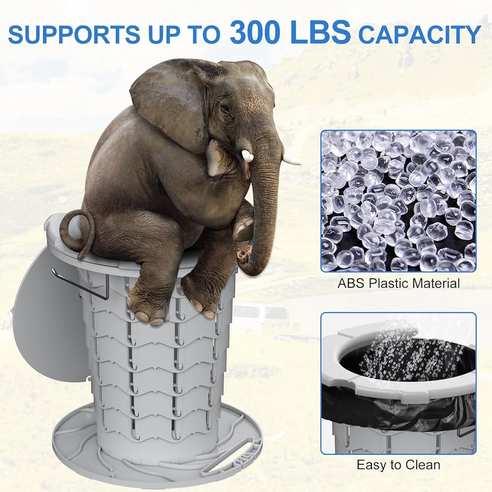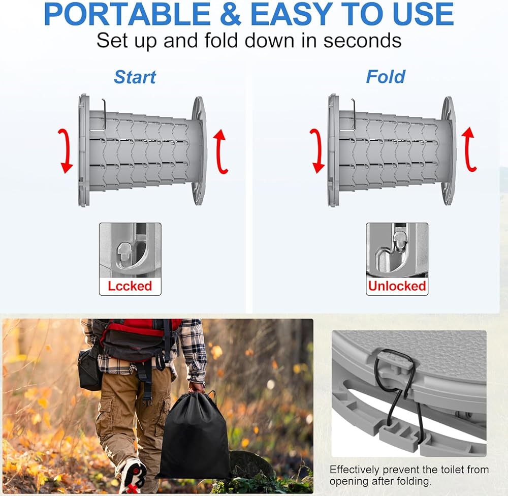 STURDY & DURABLE MATERIAL: The side panels of porta potty travel toilet is made of modified ABS plastic material with 70 latches and non-slip bases for stability. Its extremely portable design makes it the best camping potty, offering home comfort in a compact, washable, and sturdy form that can support up to 300 LBS. Our travel potty for adults comes with a waterproof handy bag for easy storage and transport and comes with two roll toilet bags.