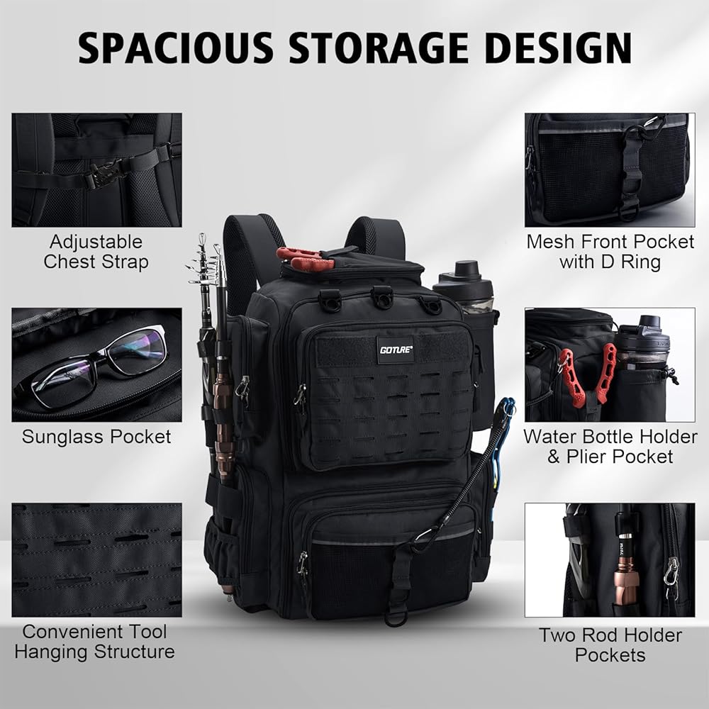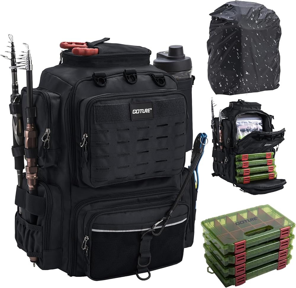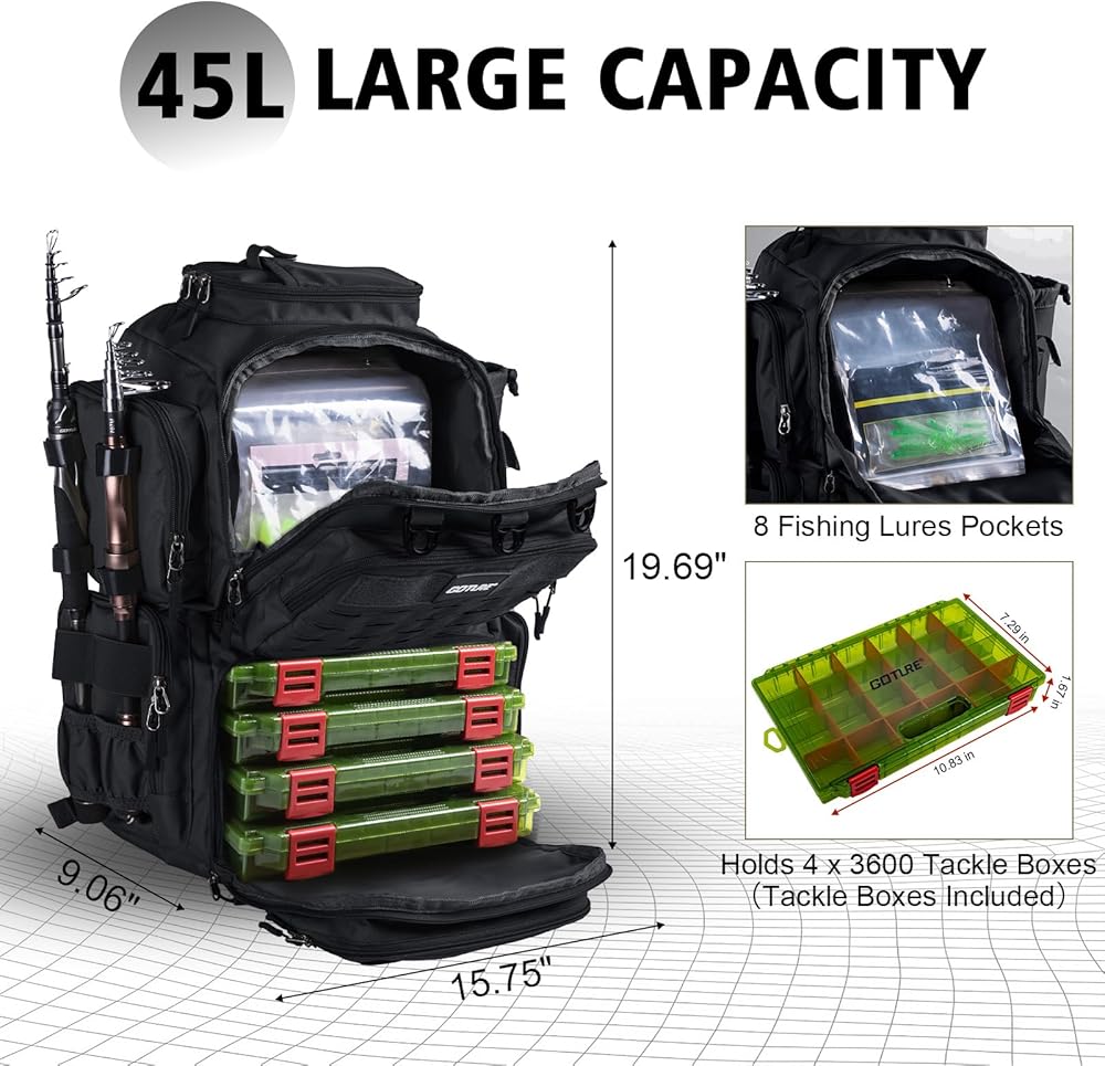 حقيبة ظهر لصيد الأسماك مع 4 صناديق معالجة ، 45 لتر 600D حقيبة ظهر مع حاملات القضبان ، 8 جيوب إغراء ، غطاء المطر ، حقيبة تخزين كبيرة لصيد الأسماك للتخييم للتخييم المشي لمسافات طويلة