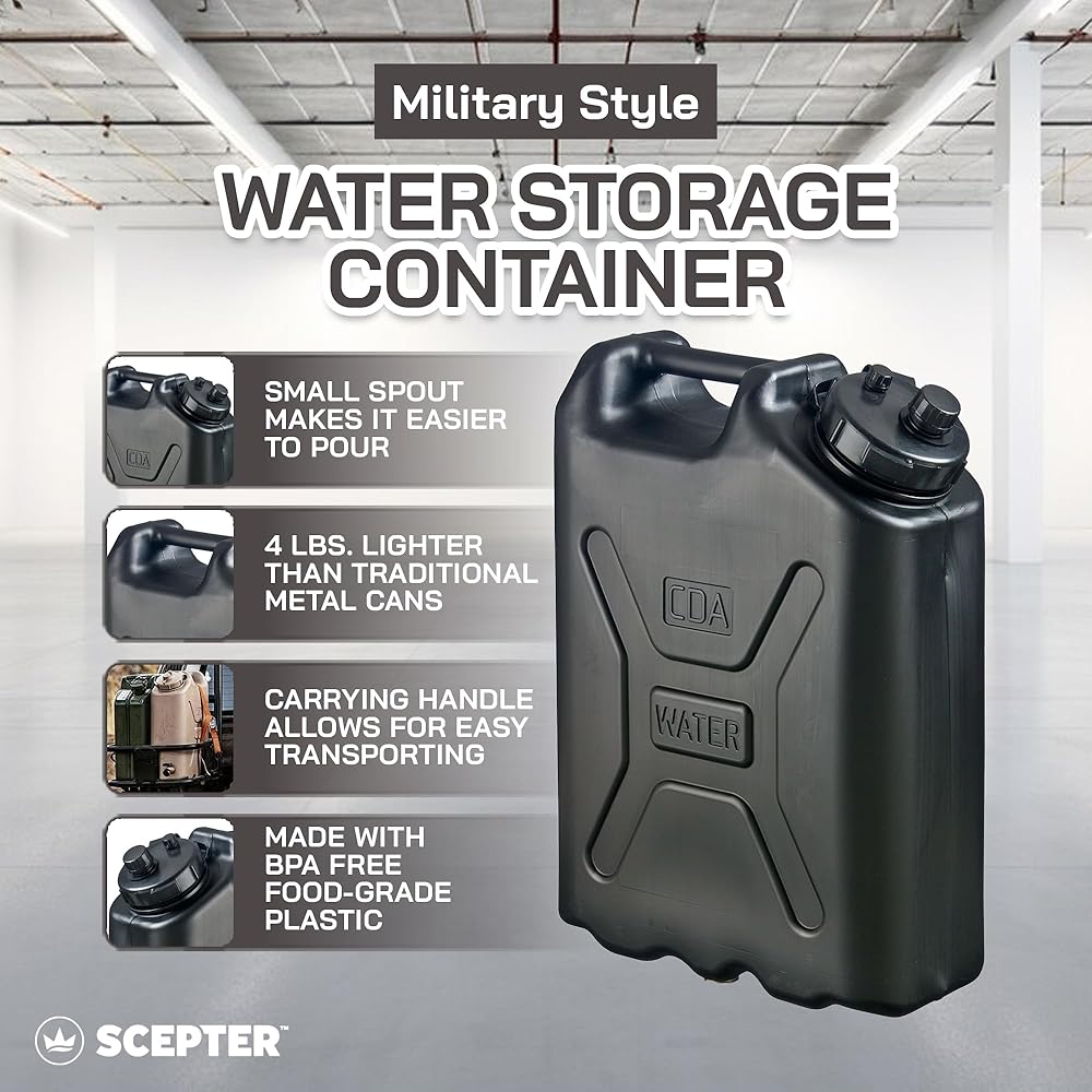 Outdoor adventures and off-road excursions can take you far from any available water. The 4 pack of Scepter 5-Gallon Military Water Containers ensures you're never left high and dry no matter how far into the wilderness you travel. Featuring a heavy-duty, military design, the container holds up to 5 gallons (20 liters) of water, taking hydration anywhere. A built-in, super-strong carry handle lets you effortlessly transport the jug from car to campsite. The durable, heavy-duty military style withstands drops, shocks, and impacts to survive the harsh conditions of any destination. Lightweight and easy to move, the container is the perfect solution for bringing hydration with you to your campsite or along on a boating excursion or off-road adventure. Fitting in your vehicle's trunk, the container also works great as an emergency water source if your car breaks down. Built from durable HDPE plastic, the container safely contains water with a non-toxic, food-grade material. BPA-free, the construction is sure to keep your water safe and ready for consumption. Letting you enjoy a refreshing drink wherever you end up, the 5-Gallon Military Water Container by Scepter brings the water anywhere it's needed.