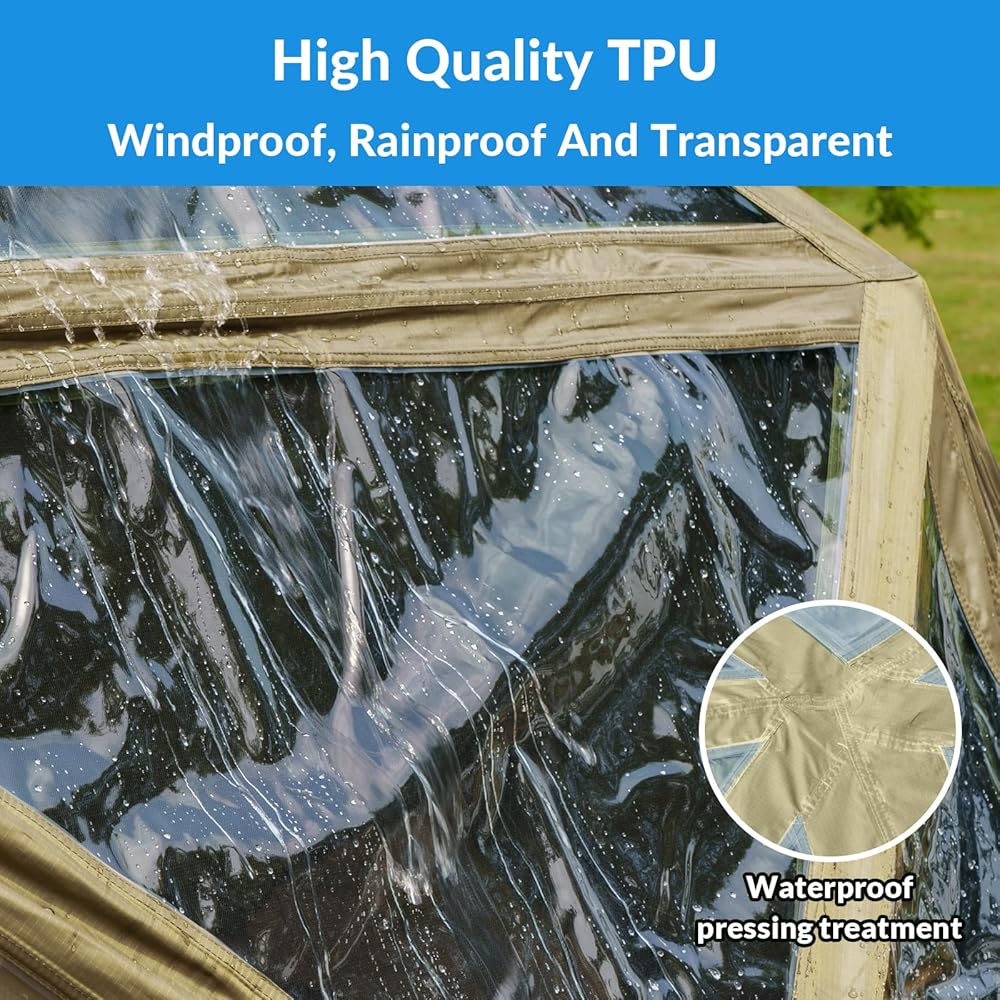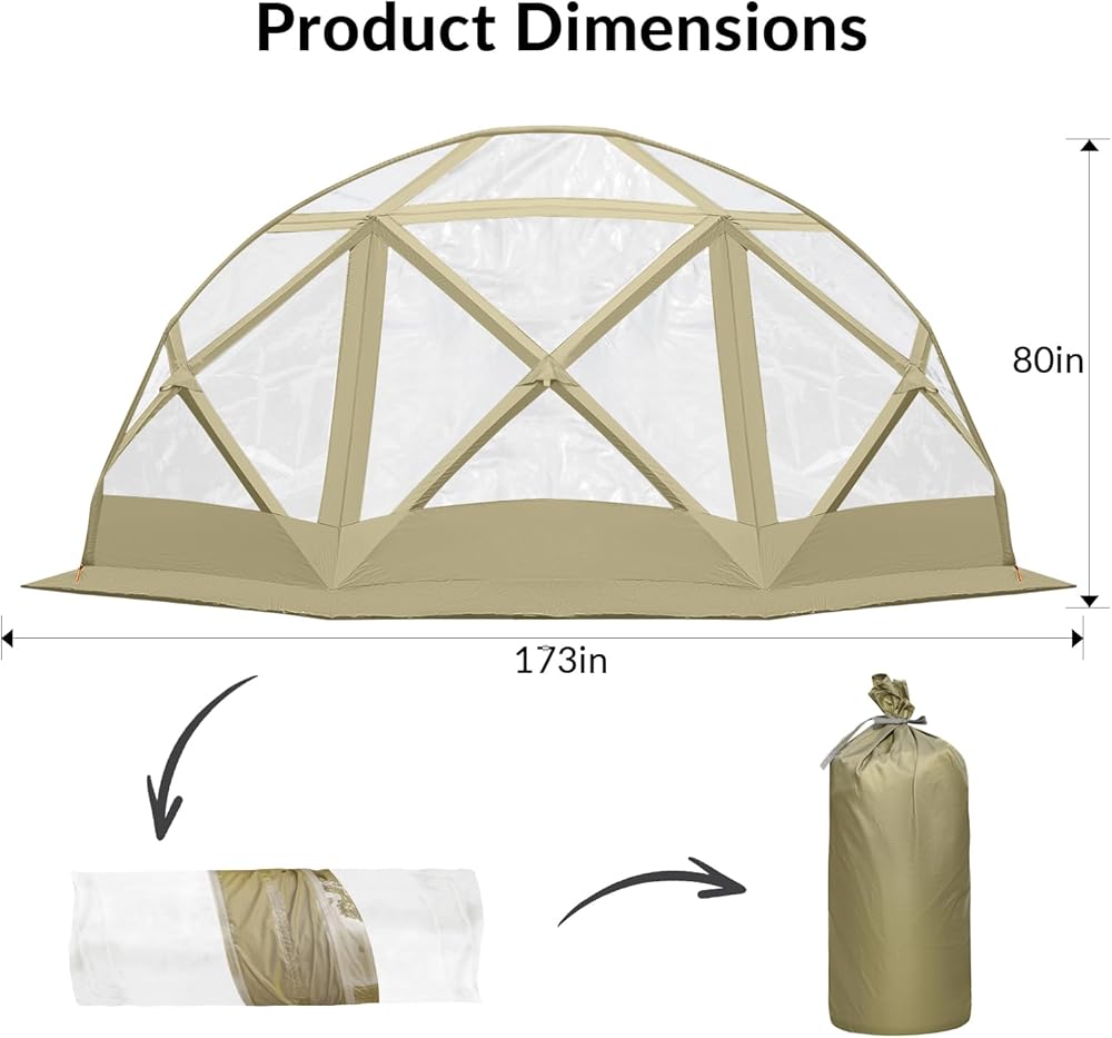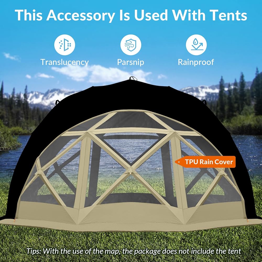 【ملحقات الخيمة】 قماش طائر المطر × 1، تغطية حائط مقاومة للمطر × 2، سجادة أرضية قابلة للإزالة × 1، أوتاد الخيمة × 16، حبال مقاومة للرياح × 16، حقيبة حمل للتخزين × 1 | الحجم غير المطوي: 157.5 بوصة طول × 157.5 بوصة عرض × 86.6 بوصة ارتفاع (مساحة أرضية 145 قدم مربع)، الحجم عند الطي: 45.3 × 11.8 × 11.8 بوصة، الوزن الإجمالي: 78 رطل. يمكنك استخدام غطاء المطر الشفاف المطابق الخاص بنا ابق داخل خيمة الشاشة واستمتع بالمشهد الممطر، مما يحسن تجربة الهواء الطلق لك ولعائلتك.