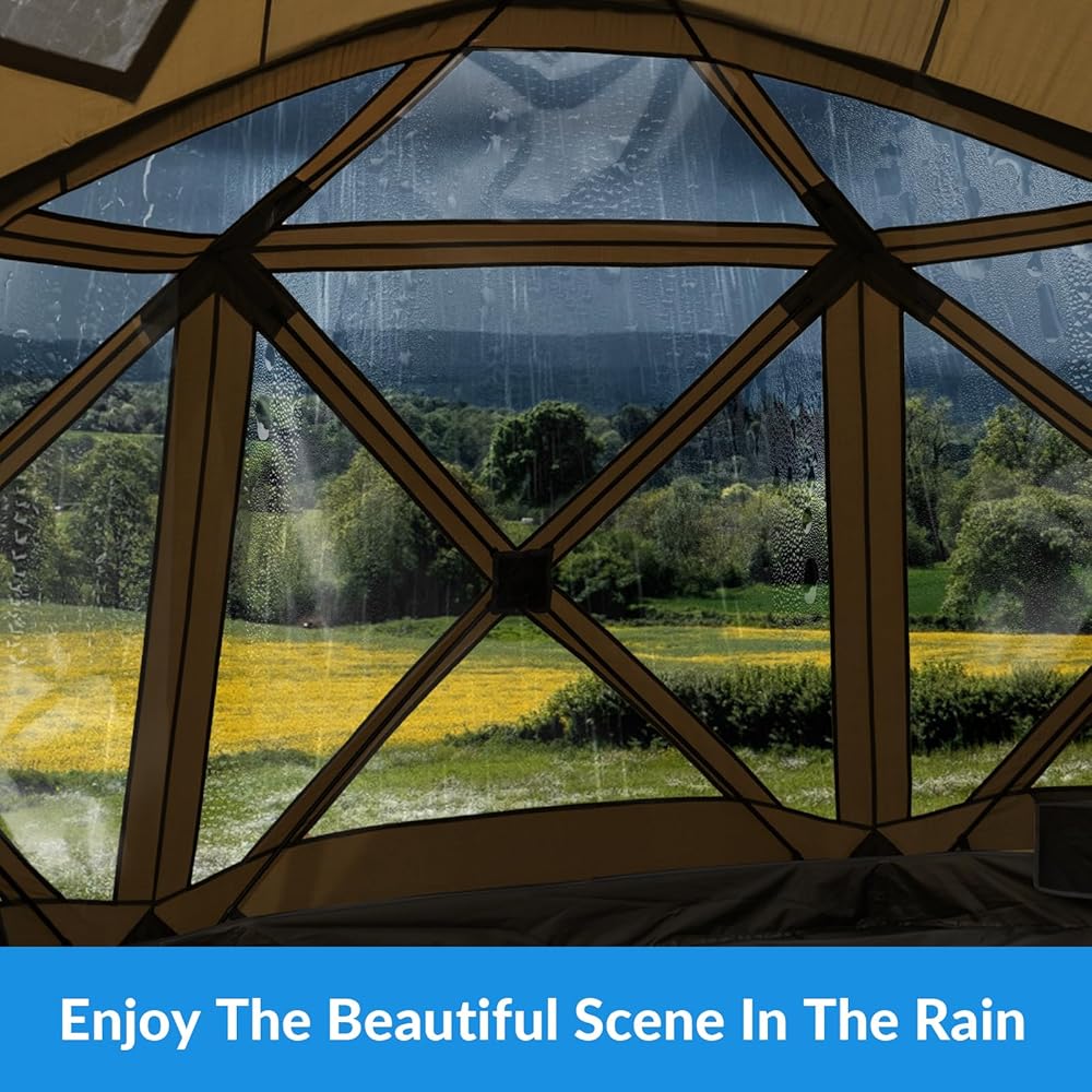 【واسعة للغاية】 تبلغ مساحة الخيمة المركزية المنبثقة الكبيرة 145 قدمًا مربعًا (157.5 بوصة طولًا × 157.5 بوصة عرضًا × 86.6 بوصة ارتفاعًا)، وهي واسعة بما يكفي للسماح لعدد من 8 إلى 12 شخصًا بالتحرك بحرية. يمكنك القيام بأي نشاط أو وضع أي متعلقات شخصية في الخيمة المسقوفة. بالإضافة إلى ذلك، هناك نوافذ ضخمة لسهولة الدخول والمشاهدة.