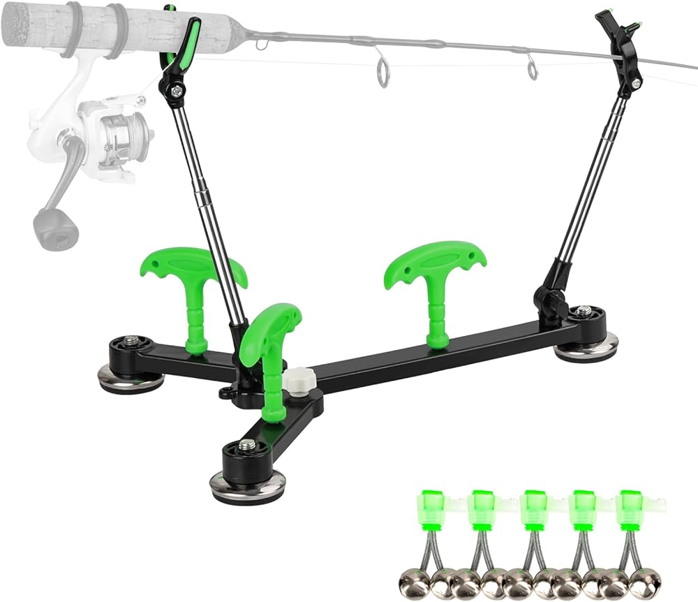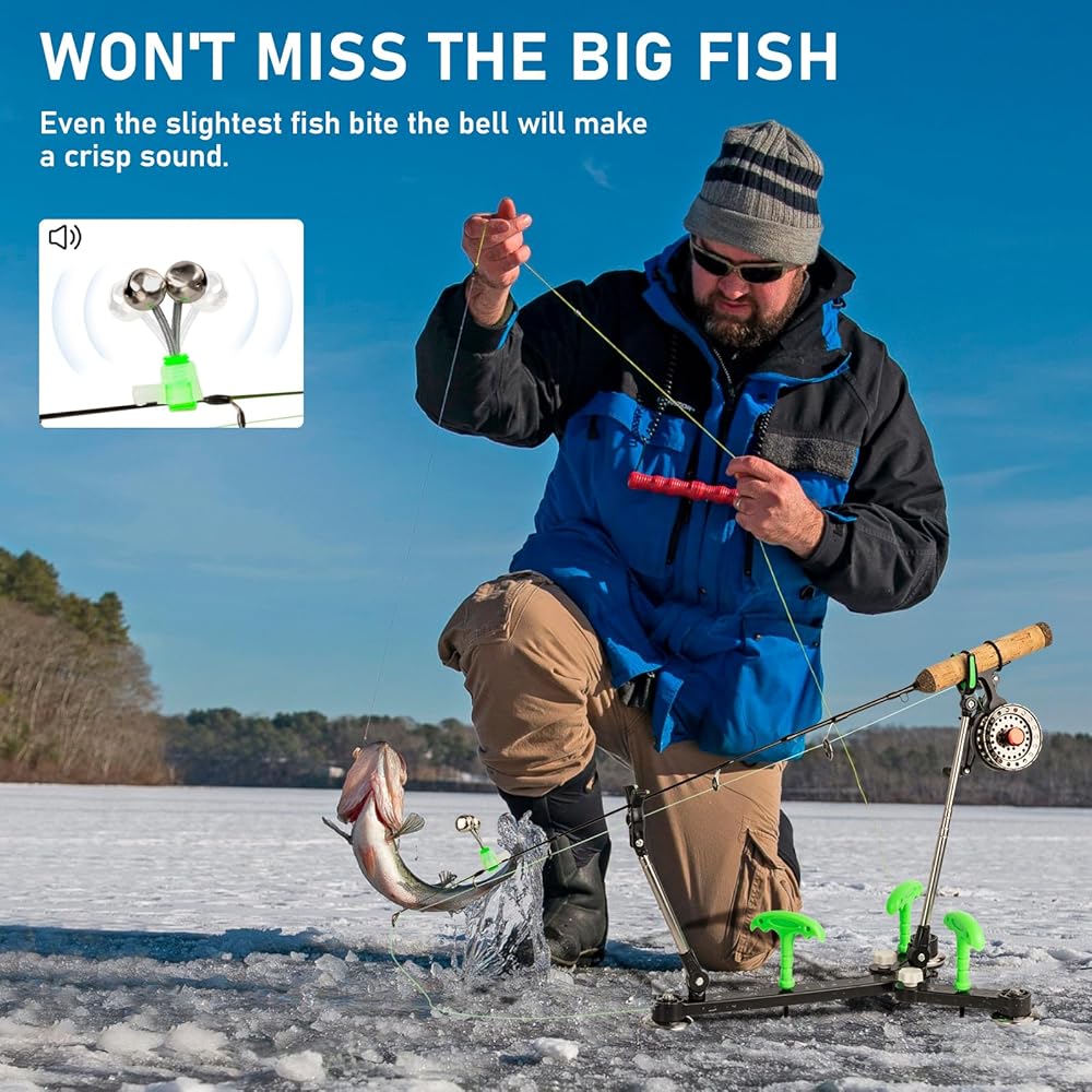 • 4. مجهزة بتذكيرات الجرس: كل حامل صنارة صيد لصيد الأسماك على الجليد مجهز بـ 5 أجراس صيد لتذكيرك بوجود سمكة تعض الطعم. يمكنك تثبيت جرس الصيد على طرف صنارة الصيد الجليدية، وحتى أدنى قضمة سمكة ستصدر صوتًا واضحًا، مما يمنعك من تفويت الأسماك الكبيرة