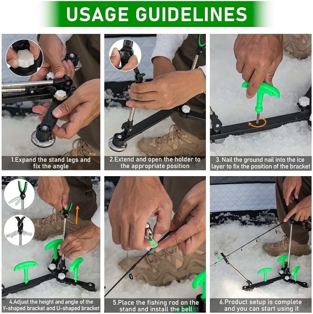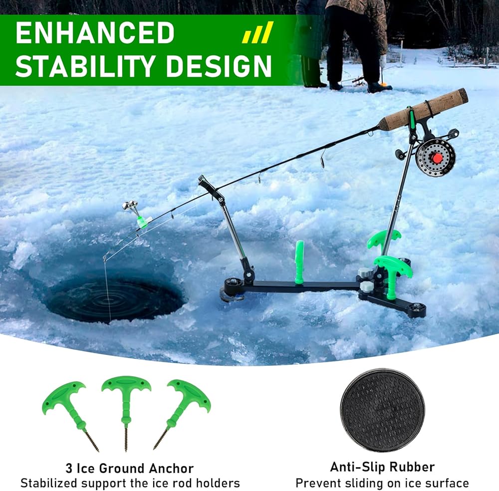 • 2. تصميم الاستقرار المعزز: يتميز طرف الصيد على الجليد هذا بهيكل مثلث عند فتحه، مما يوفر أقوى استقرار. تمت إضافة الجزء السفلي من الأرجل الثلاثة بتصميم حبيبي مضاد للانزلاق، وكل رف لصنارة صيد الجليد مجهز بـ 3 أظافر أرضية. يمكنك تثبيت المسامير الأرضية في طبقة الجليد من خلال الفتحات المحفوظة على الأرجل الثلاثة لحامل صنارة صيد الجليد. يمكن إدخال المسامير في طبقة الجليد بمقدار 1.7 بوصة في الأسفل لمنع حامل صنارة الصيد من الانزلاق