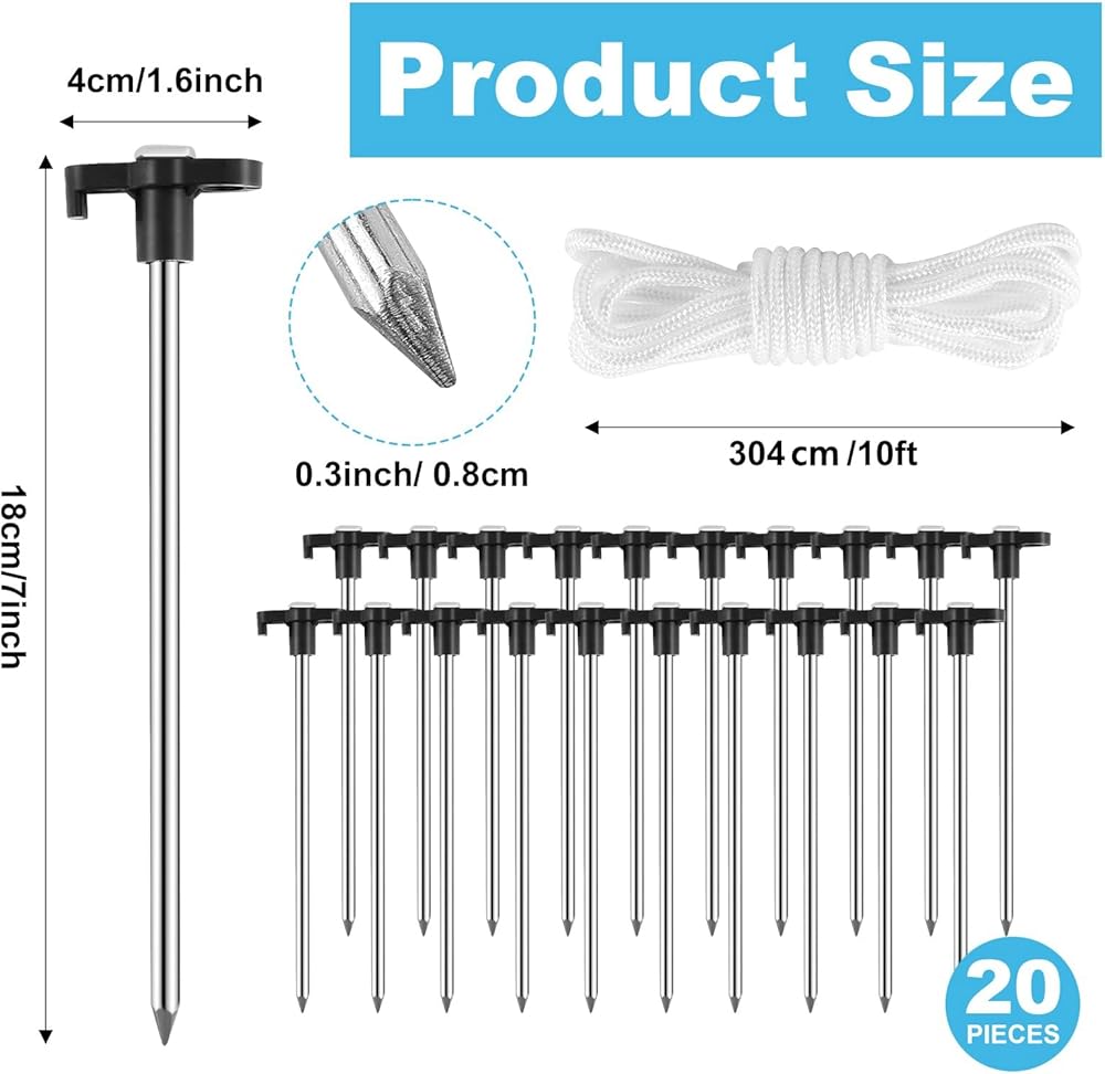 20 قطعة من حصص الخيمة شديدة التحمل، أوتاد خيمة معدنية مقاس 7 بوصات، أوتاد تخييم غير قابلة للصدأ مع حبال بطول 2 × 10 أقدام، أوتاد ساحة مجلفنة أوتاد أرضية لخيمة التخييم في الهواء الطلق، مظلة