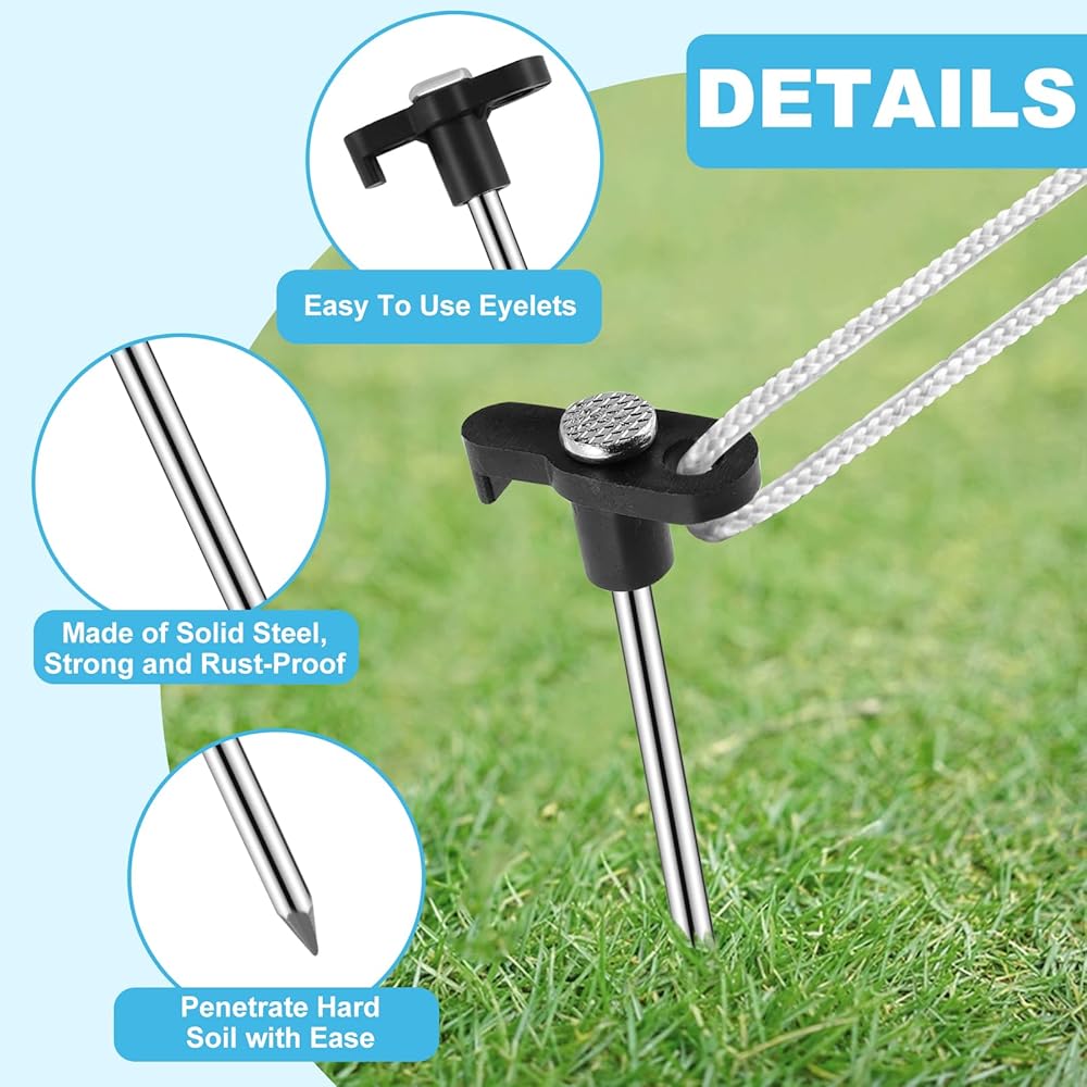 أوتاد أرضية متعددة الأغراض: تُستخدم أوتاد الخيمة شديدة التحمل في مجموعة متنوعة من المواقف، يمكنك استخدامها لتأمين الخيام والأقمشة ورفوف الحبال والمظلات ومظلات الشاطئ والأسوار والمظلات والمزيد. تعمل أوتاد الخيمة في العشب والتربة والتربة الصخرية، مما يجعلها أداة احترافية لاستضافة المناسبات الخارجية.