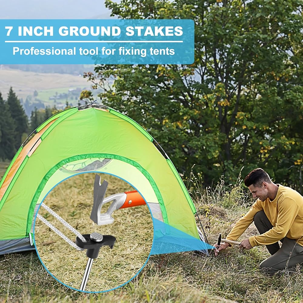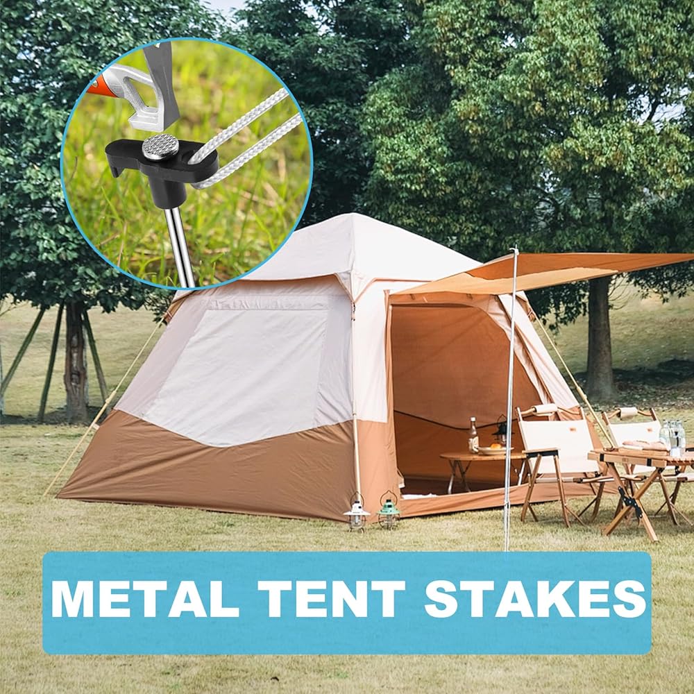 حصص الخيمة المعدنية: ستحصل على 20 وتدًا أرضيًا بخطافات سوداء وحبلين (10 أقدام). يمكن لأوتاد الخيمة المعدنية تأمين خيمتك بأمان وثبات، مما يوفر لك تجربة ممتعة أثناء الرحلة.