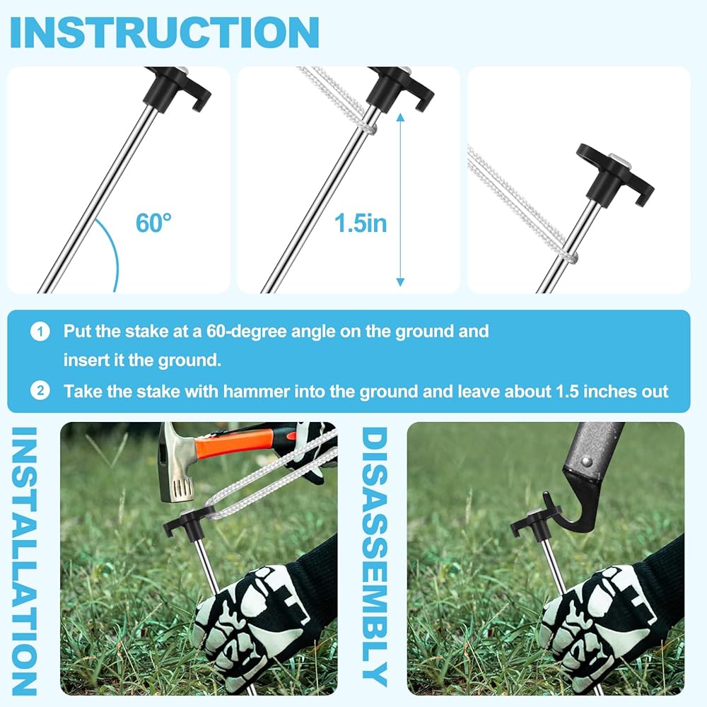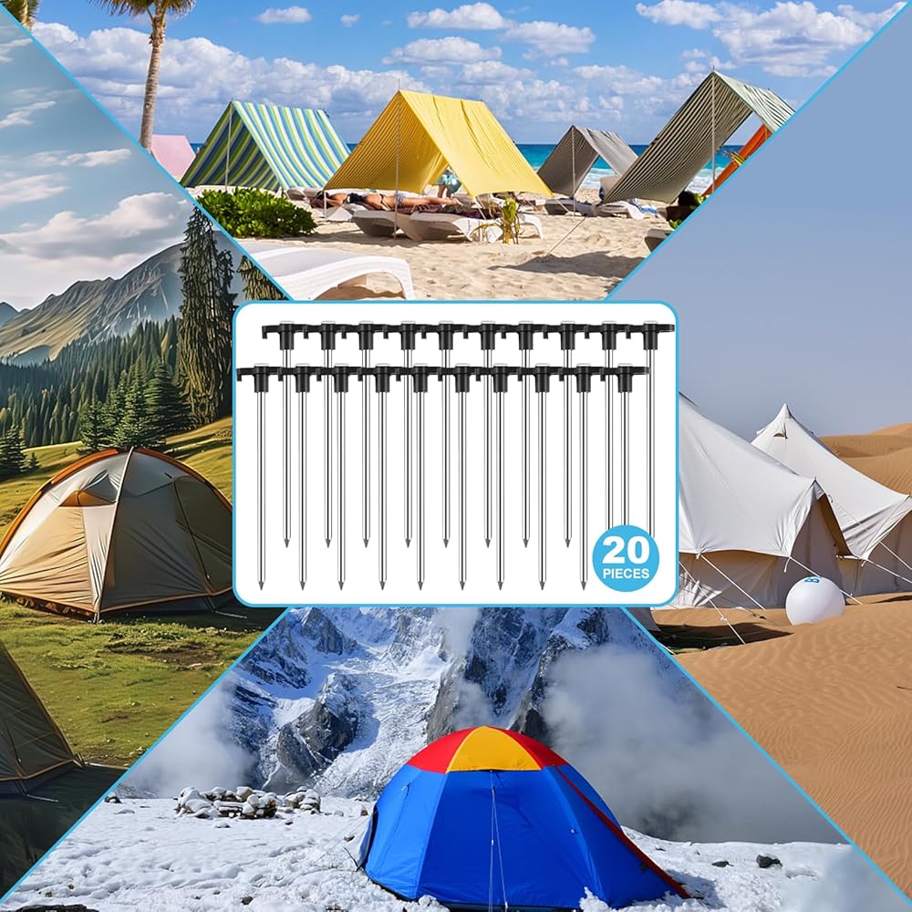 سهلة الاستخدام: تم تصميم أوتاد خيمة التخييم بأطراف مطحونة يمكن إدخالها بسهولة في التربة الصلبة بزاوية 60 درجة، مما يوفر الموثوقية والثبات للخيمة. يمنع الجزء العلوي على شكل حرف T الأوتاد من الغرق عميقًا ويستخدم مطرقة الخيمة لسحب خيمة التخييم للخارج.