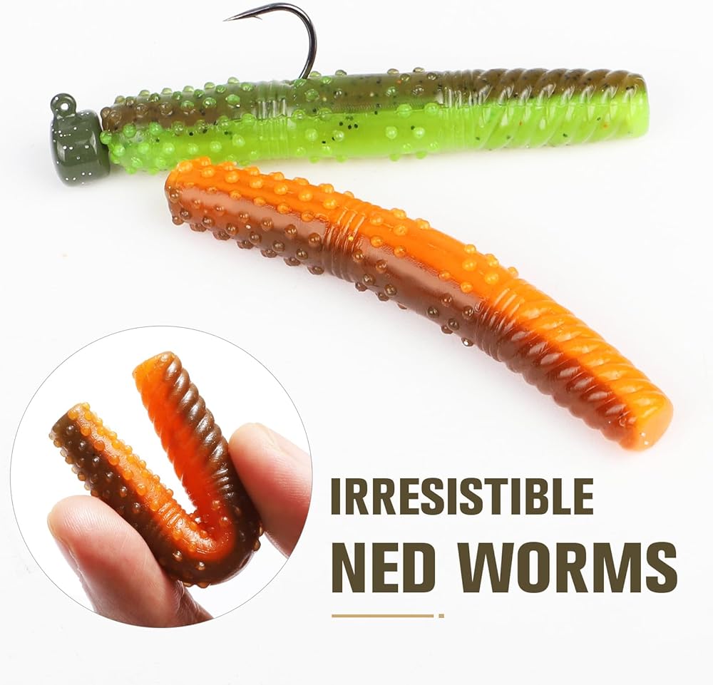 【ديدان نيد التي لا تقاوم】: الدودة هي الطعم الكلاسيكي لجهاز نيد. مصبوب مع التضليع من الرأس إلى الذيل. مع ذيلين مسطحين تم تصميمهما ليتوافقان بسلاسة مع Ned Rig Head للحصول على أفضل عرض تقديمي. عند استخدامها مع نيد جيجز، تقف الديدان في وضع مستقيم في الماء. كل ارتعاش في طرف القضيب يتسبب في ارتعاش الذيل المستقيم والرقص، مما ينتج عنه حركات واقعية ويحفز الهجمات من الأسماك الأقل نشاطًا. دائمًا ما يثير الضربات حتى في أصعب الظروف.