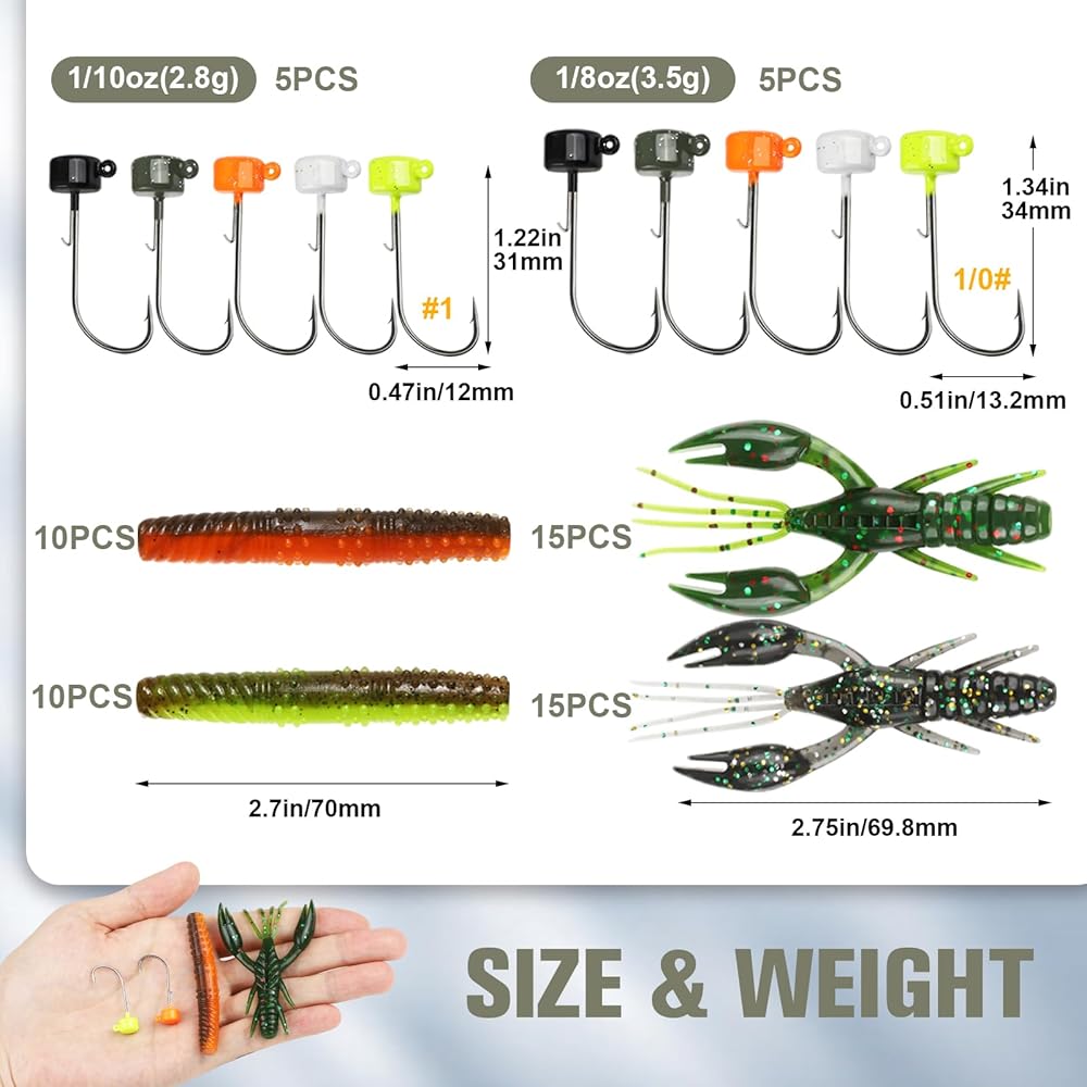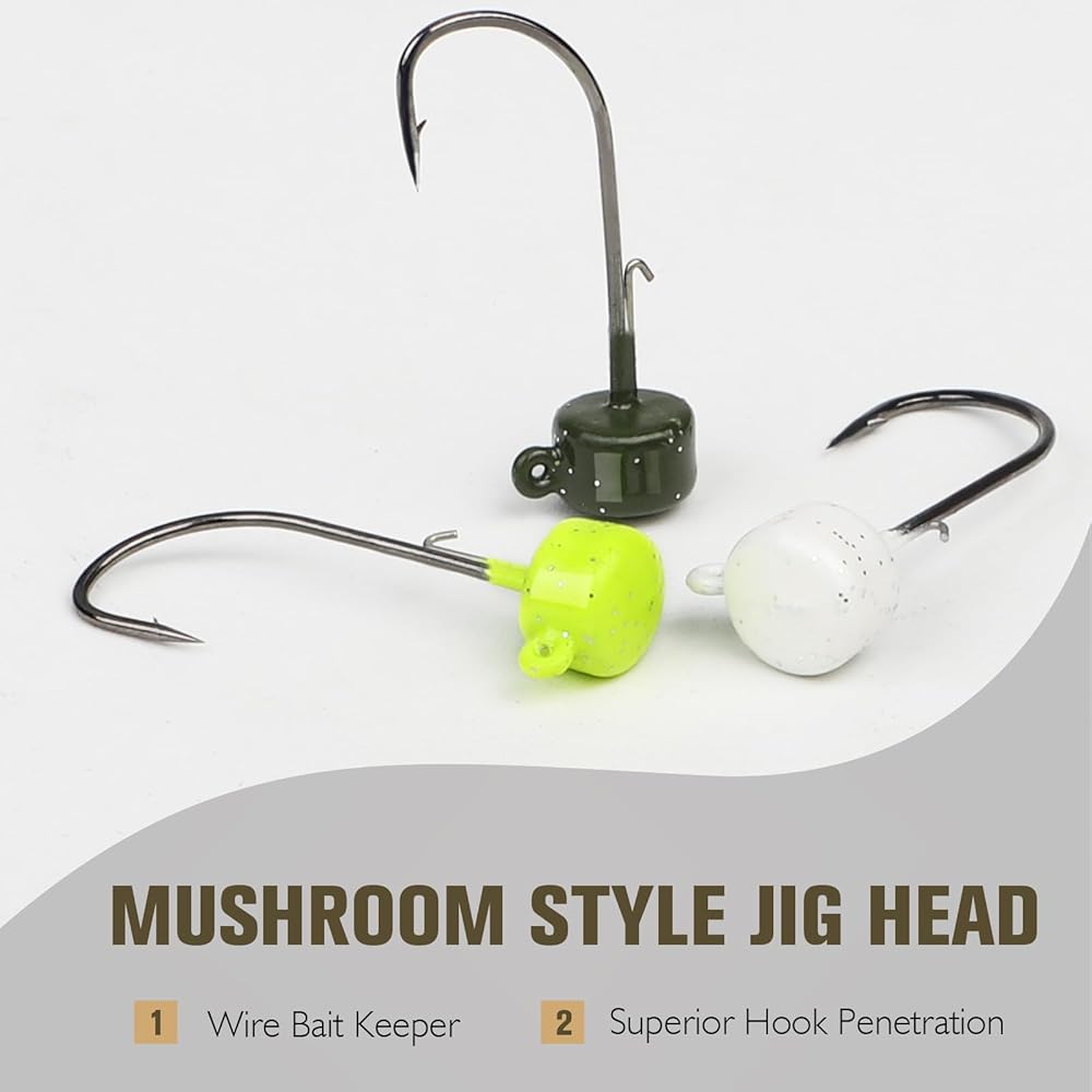 【رؤوس Ned Rig Jigs الأساسية】: توفر رأس الفطر الكلاسيكية عرضًا أكثر واقعية وتسمح للطعوم بالجلوس بشكل مستقيم في الأسفل. كما أنها تحتوي على حامل طعم سلكي لإبقاء الديدان في مكانها. تم تصميم أدوات الرأس على شكل فنجان الشاي للعمل مع خطافات دودة الأوفست. يسمح انحناء الفجوة الواسعة جدًا للصيادين باستخدام الديدان وإخفاء نقطة الخطاف. تعد هذه المجموعة خيارًا مثاليًا للاستكشاف حول الفرشاة والنباتات أو الصيد بالضغط العالي.