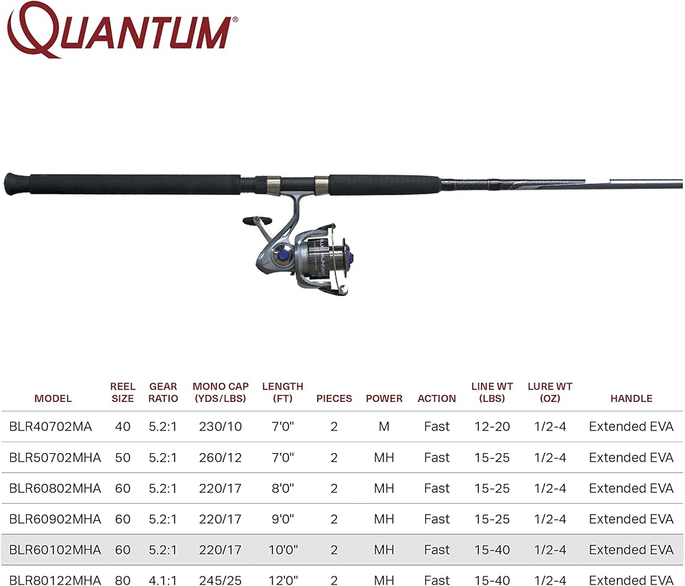 حركة سريعة: توفر مجموعة صنارة الصيد Quantum Blue Runner المكونة من قطعتين بطول 10 أقدام حركة سريعة وقوة متوسطة ثقيلة، مما يجعلها مثالية لالتقاط الأنواع الثقيلة مثل سمك السلور والقطط.