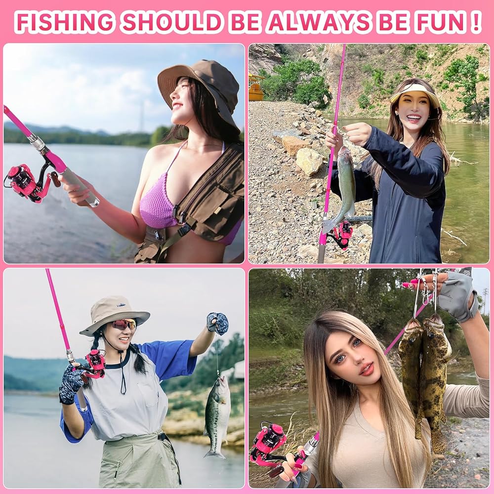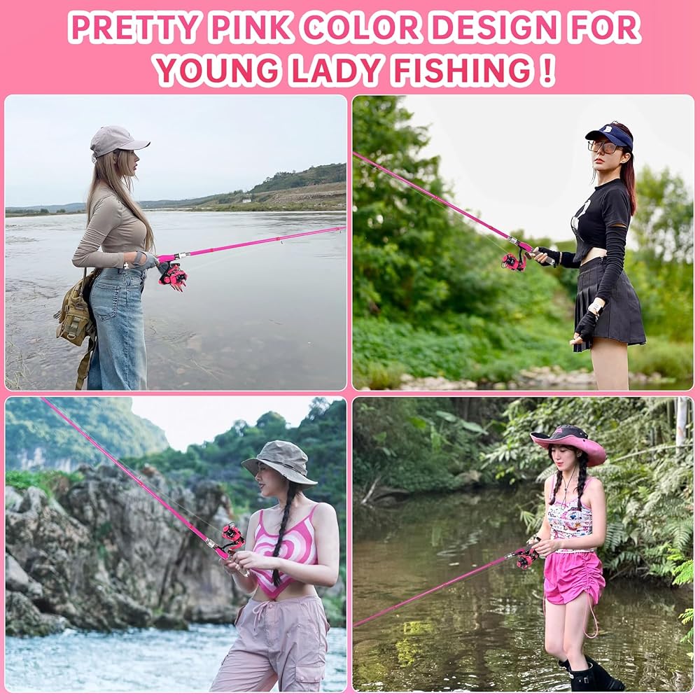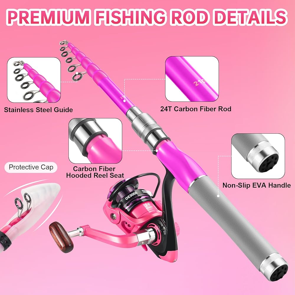 مجموعة صنارة وبكرة صيد السمك للسيدات، طقم صنارة صيد تلسكوبية من ألياف الكربون مع بكرة دوارة، خط صيد، طُعم صيد السمك، حقيبة سفر للنساء والفتيات المبتدئات في المياه العذبة (وردي)