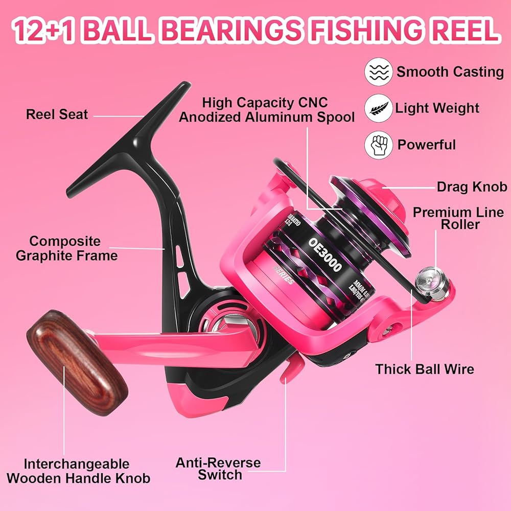 🐟 【أحدث صنارة صيد وردية مطورة】- تصميم بلون وردي جميل وأحدث تصميم لعام 2024 مع ألياف الكربون عالية الكثافة ممزوجة بالألياف الزجاجية تجعل عمود الصيد الخاص بك صلبًا وقويًا. تتميز صنارة الصيد هذه بأنها صغيرة الحجم وخفيفة الوزن لتتمكن من حملها وإلقاءها.