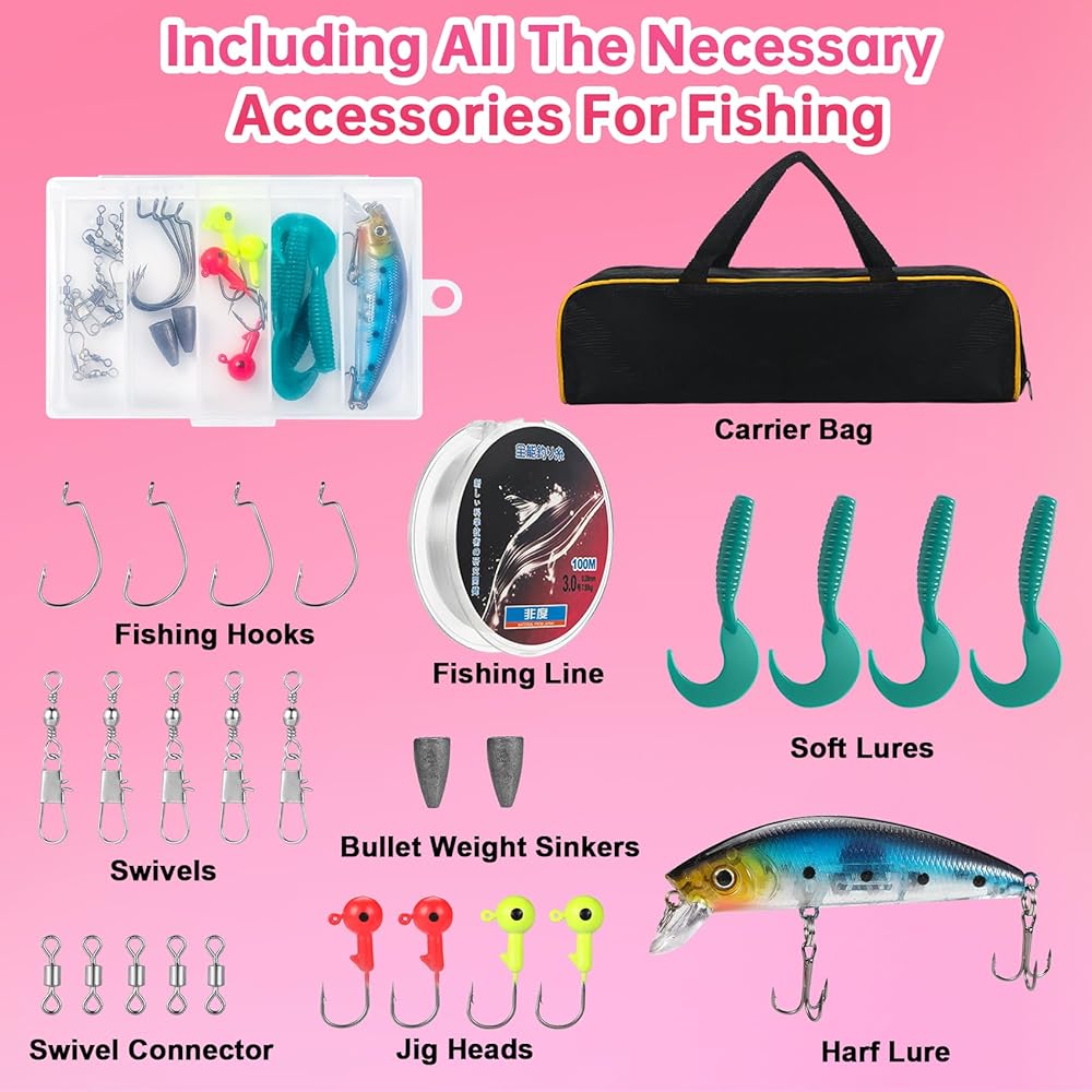 🎣【طقم صنارة صيد السمك للسيدات ذو المظهر الرائع】- تم تصميم طقم صنارة الصيد للسيدات ذو المظهر الرائع خصيصًا للمبتدئين في صيد الأسماك. تتضمن حقيبة سفر، وعمود صيد (6.89 قدمًا)، وخط صيد، وبكرة صيد دوارة، وصندوق أدوات، والكثير من الطُعم الناعم وخطافات الصيد التي تحتاجها عندما تحتاج إلى الصيد. سيجعل الصيد أسهل بكثير وأكثر متعة.