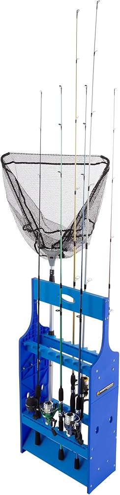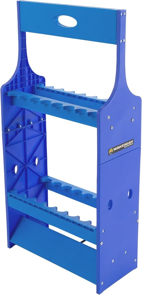 -Easy To Assemble- This Freestanding Fishing Rod Rack Occupies Little Floor Space, Perfect To Position On The Floor. Although Lightweight, This Vertical Rack Holds Up To 16 Freshwater Or Salt Water Rods, Spinning Or Stable, Without The Reels Attached.Durable Materials- The Sturdy Abs Plastic Keeps Rods Safe And Organized, Whether You'Re A Seasoned Angler Or An Occasional Hobbyist. The Sleek Design Occupies Minimal Floor Space, And Is Perfect For A Tucked Away Corner In The Home Or Garage!Keep Rods Organized And Tangle Free- This Holder Casts Out The Ordinary With A Functional And Attractive Design That Keeps Poles Safe After A Tranquil Day On The Water. In Addition, This Organizer Includes A Built In Carrying Handle For Portability.Product Details- Dimensions: 17.5” (L) X 8.25” (W) X 35.” (H). Color: Blue. This Rod Rack Is Made Of Durable Abs Plastic And Can Hold Up To 16 Rods.Satisfaction Guaranteed- Wakeman Outdoors Is Committed To Providing Consumers With The Absolute Best Price And Value On Products. Note: This Is An Exclusive Product And Only Fishing Rack Plastic Holder For 16 Rods By Wakeman Are Guaranteed To Be Genuine